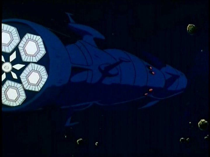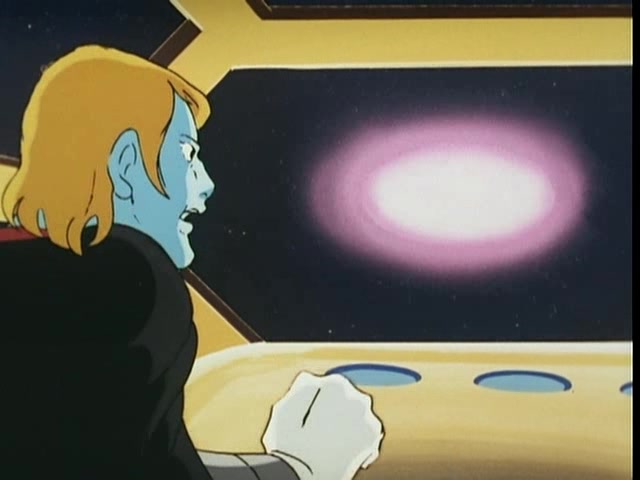 But the Star Force is not alone in space. Close behind them, and in pursuit, is Leader Desslok’s flagship. STAR BLAZERS saves itself a few moments here by having moved the footage showing Desslok’s escape on Gamilon two episodes earlier. He’s also got a great new signature weapon: the Desslok Gun, his own version of the Wave-Motion Gun. He fires at the Argo the moment the ship is in range, but he falls victim to the curse of the one-second-too-late shot that was a motif for this show, as the Star Force unknowingly makes its final warp towards the solar system just before Desslok’s blast hits it.