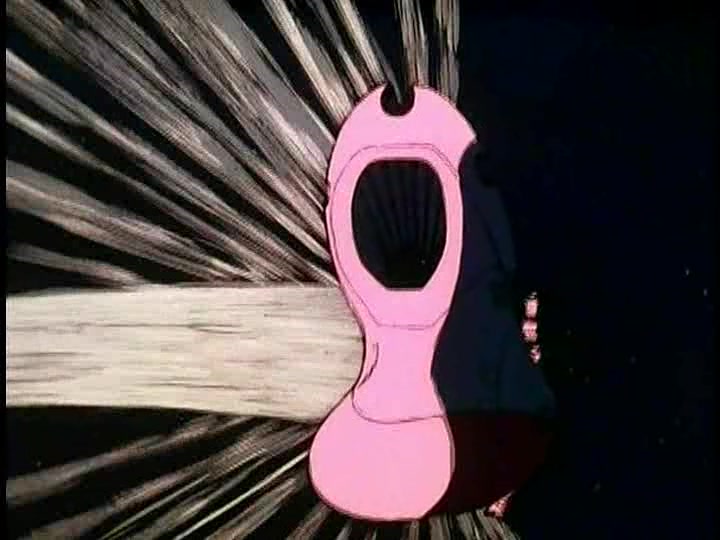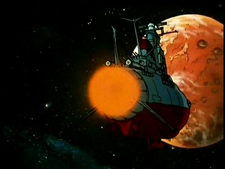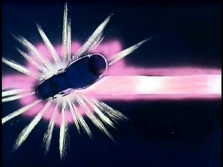 But then, Sandor activates a switch and the entire hull of the Argo begins to glow and shimmer. He’s devised a defense for the ship that works on the same principle as the Gamilon Reflex Gun on Pluto, and it reflects the Desslok Gun blast right back at Desslok’s own ship, destroying it and him. (Or so it would seem for the moment–the trailer for the next episode would show clearly that Desslok survived.) This Deus Ex Machina defense system was a byproduct of the fact that the YAMATO production team thought that this was going to be the final episode ever–despite the fact that there are subsequently dozens of occasions on which such a defense would have been invaluable, it is never used or even mentioned again. In any event, the way to Earth is now clear at last.
