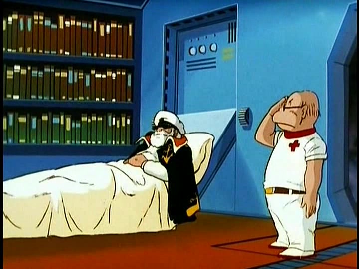 STAR BLAZERS doesn’t mess around with the fact that Captain Avatar is dying (and, spoiler, dies.) I expect that it was just too key a plot point, both in this episode and in future ones, for them to try to obfuscate. But especially in the quiet, contemplative manner in which he meets his end, Captain Avatar’s final hours are strongly remembered by fans for their emotional power. As Doctor Sane tends to him, he tells the Doctor, “I dreamed of Earth last night, the way it was before the bombings, green and cool.” When Sane replies that it sounds like a nice dream and he dreamed about his cat, Avatar continues, “And there was a fresh wind. And my wife, standing at the window with my son. I want to see my dear Earth just one more time“