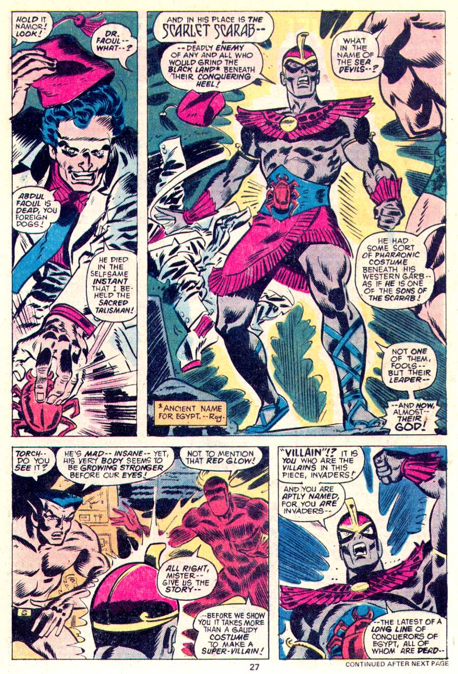 Breaking into the Pyramid, Namor and the Torch find a mystic red scarab of possibly-alien origin–and Dr Faoul takes the opportunity to seize it, transforming himself into the Scarlet Scarab. He’s actually the leader of the Sons of the Scarab, of course, and he wants the Allies out of Egypt. At the time, I had no idea that this was all a bit of a play on writer Roy Thomas’ first professional assignment, a story of the Blue Beetle, who himself gained superhuman powers from a mystic scarab. But that was Roy all over.