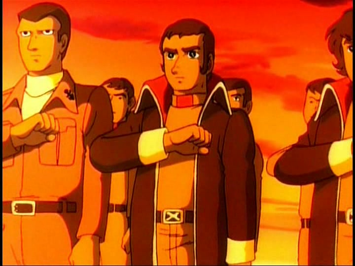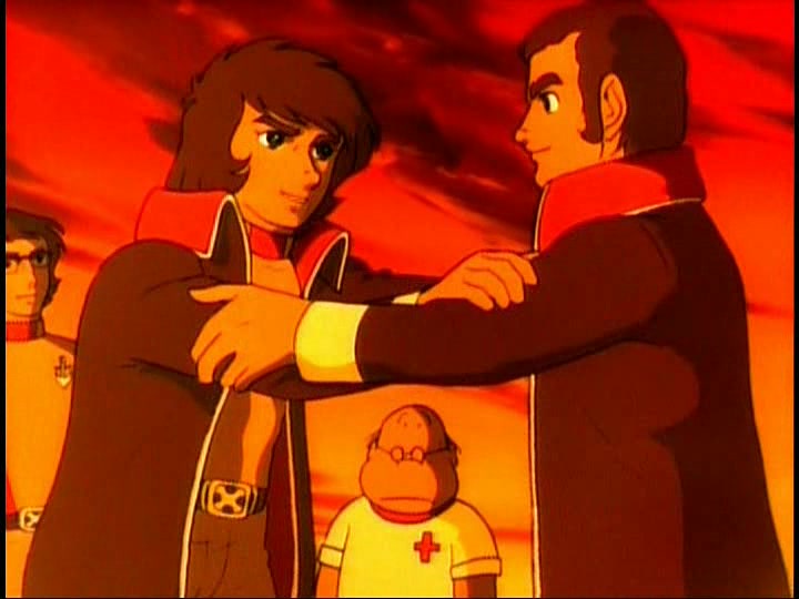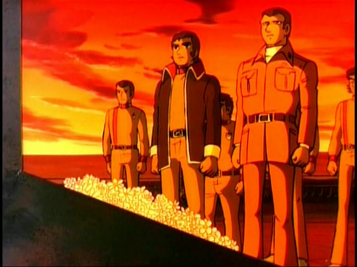 That evening, out at the Captain’s memorial statue (this area is known as Hero’s Hill in YAMATO 2, but is never especially named in STAR BLAZERS) Doctor Sane sits by himself getting drunk (“You were right about the cool, fresh spring water you talked about!’) until the rest of the Star Force breaks his reverie by showing up on schedule to pay their respects to the man who led them to Iscandar and back. It’s an iconic scene, lifted in its entirety from SARABA YAMATO, so the animation is film quality as well. Nova and Wildstar turn up last, and Wildstar has a quick reunion with his old rival Venture (“What’s the cowboy of outer space doing down here on Earth?“) before the Doctor calls them all to attention.