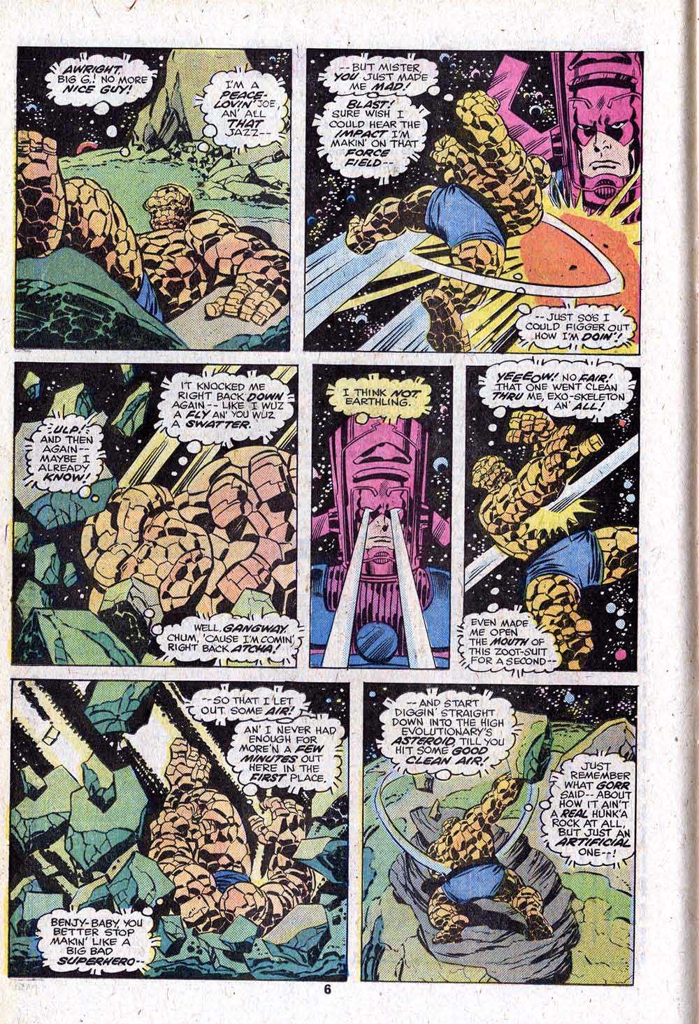 In typical Marvel fashion, the story picks up where the last one left off: the Thing, having come out on top in his slugfest with Galactus’ current herald the Destroyer found himself face-to-face with the Big G himself. After the obligatory recap of what had gone before, Ben launches himself at Galactus, but is unable to penetrate the giant’s protective force-field. What’s worse for Ben, his oxygen supply within the exo-skeleton he’s wearing to simulate his powers and form as the Thing is beginning to dwindle, so he has to turn away from Galactus and attempt, unsuccessfully, to burrow his way through the artificial asteroid that they are both standing on to get to fresh air.