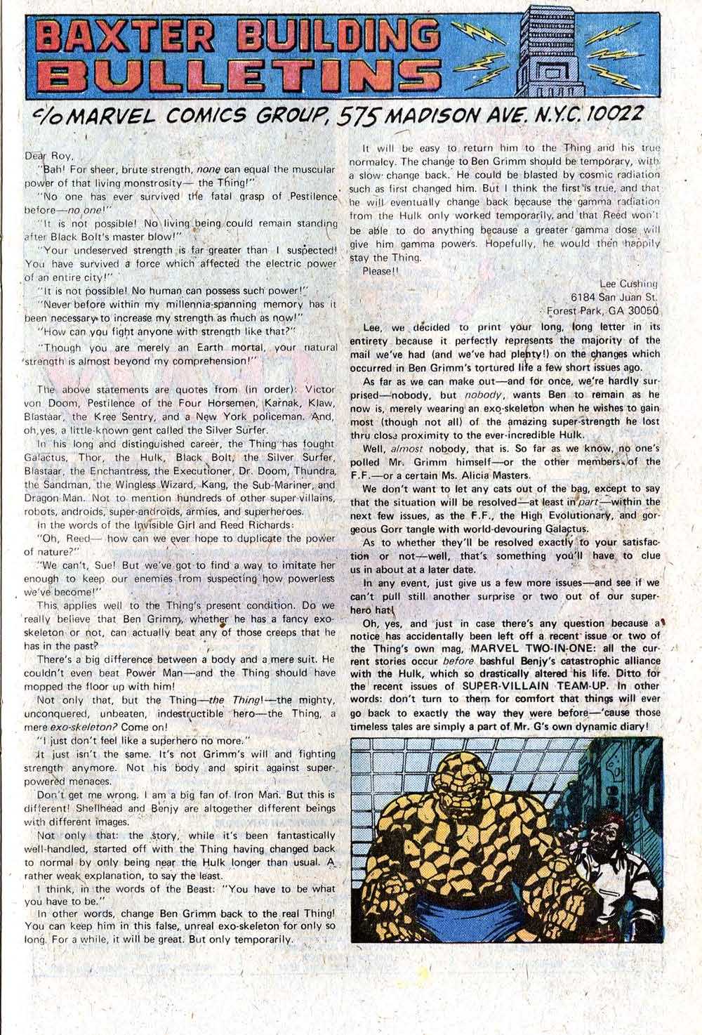 This is the point where the letters page, Baxter Building Bulletins, falls in the issue, which runs only a single letter about the Thing’s latest transformation, the loss of his powers and the exo-skeleton that he’s presently using. It was a fascinating letter to me, because letter-writer Lee Cushing dropped in several quotes from earlier FF stories concerning the Thing’s strength and power. I didn’t know where these quotes all came from, or understand the context of all of them, but they fascinated me.