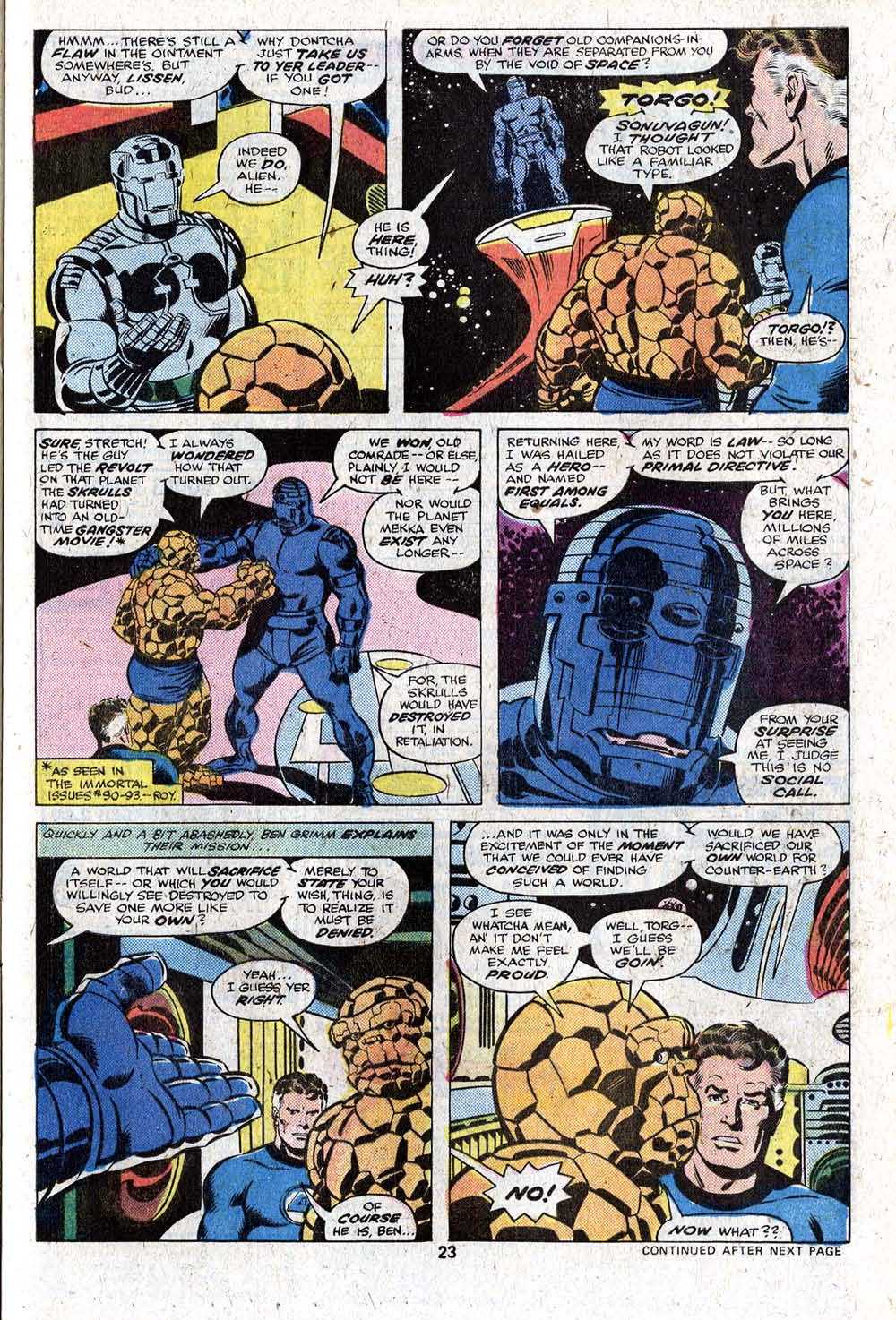Reed and Ben teleport to the first of the prospective planets, which turns out to be a world of mechanical life-forms, the planet Mekka. There, Ben runs into his old sparring partner Torgo, whom he had battled years ago in the Skrulls’ slave-pens. Torgo is now the leader of the Mekkan civilization, and of course he doesn’t plan on sacrificing his world to Galactus. What’s more, when Reed and Ben move to depart, Torgo and his guys attack them, concerned that they might in a moment of weakness offer up Mekka to Galactus in order to save Counter-Earth.
