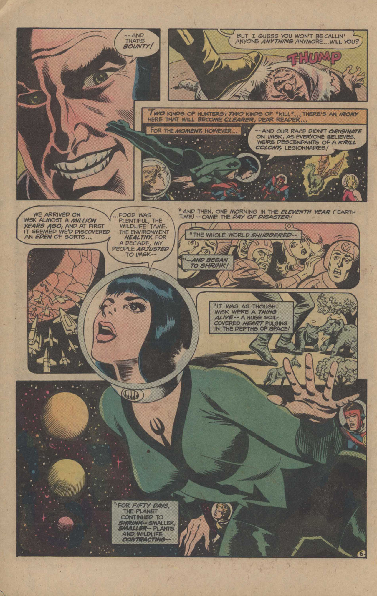 While the Legion is completing its hunt, we go elsewhere, where we are introduced to Bounty, an intergalactic Regulator who is a hunter of a different sort: he goes after wanted criminals for the rewards placed on their heads, hence his name. Back in Imsk space, a too-enthusiastic Colossal Boy pulls off too many Dragon-scales at once, causing an energy discharge that somehow causes himself, Violet, Saturn Girl and Lightning Lad to be merged into a single composite entity. This Composite Legionnaire blasts Superboy, then makes off with the Legion Cruiser, heading back towards Earth.