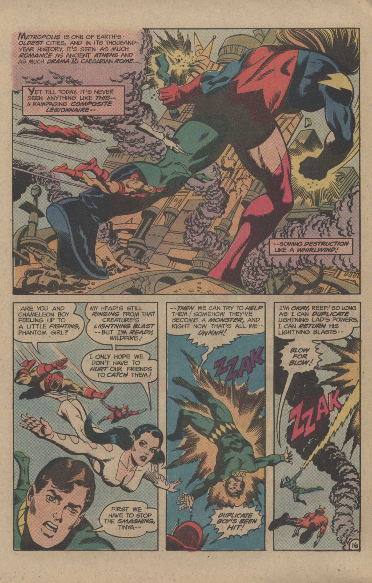 At Legion Headquarters, there’s some drama going on where new leader Wildfire is pissed that the United Planets intends to put a watchdog into place to have oversight on the legion;s activities. This leads a few of the members to question Wildfire’s qualifications to be leader, as well as causing the man himself to brood on his disembodied state. But action breaks out when the Legion Cruiser lands, and the Composite Legionnaire emerges, flattening Chameleon Boy and Phantom Girl before attacking the headquarters itself.