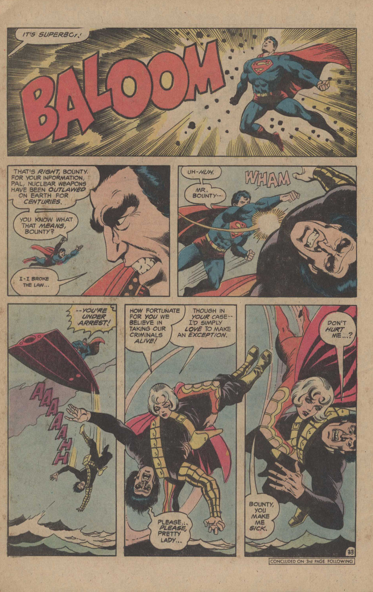 Bounty is becoming more stressed and unhinged as the fight goes on–his reputation is on the line! So much so that he unleashes an outlawed Sub-Nuclear Air-to-Air Sensor Controlled Proximity Missile at the Composite, determined to destroy it at all costs. but just then, Superboy returns from space, and is able to harmlessly take the explosion on his chest. But Bounty has now broken the law himself, and so the Legionnaires take him into custody. Elsewhere, in a much-too-quick resolution, Wildfire is dropped onto the Composite Legionnaire, where he explodes with the radiation needed to separate it back into its component parts. So the day is saved–but not for Wildfire! The strain of having done all of this has left him at death’s door! To Be Continued!