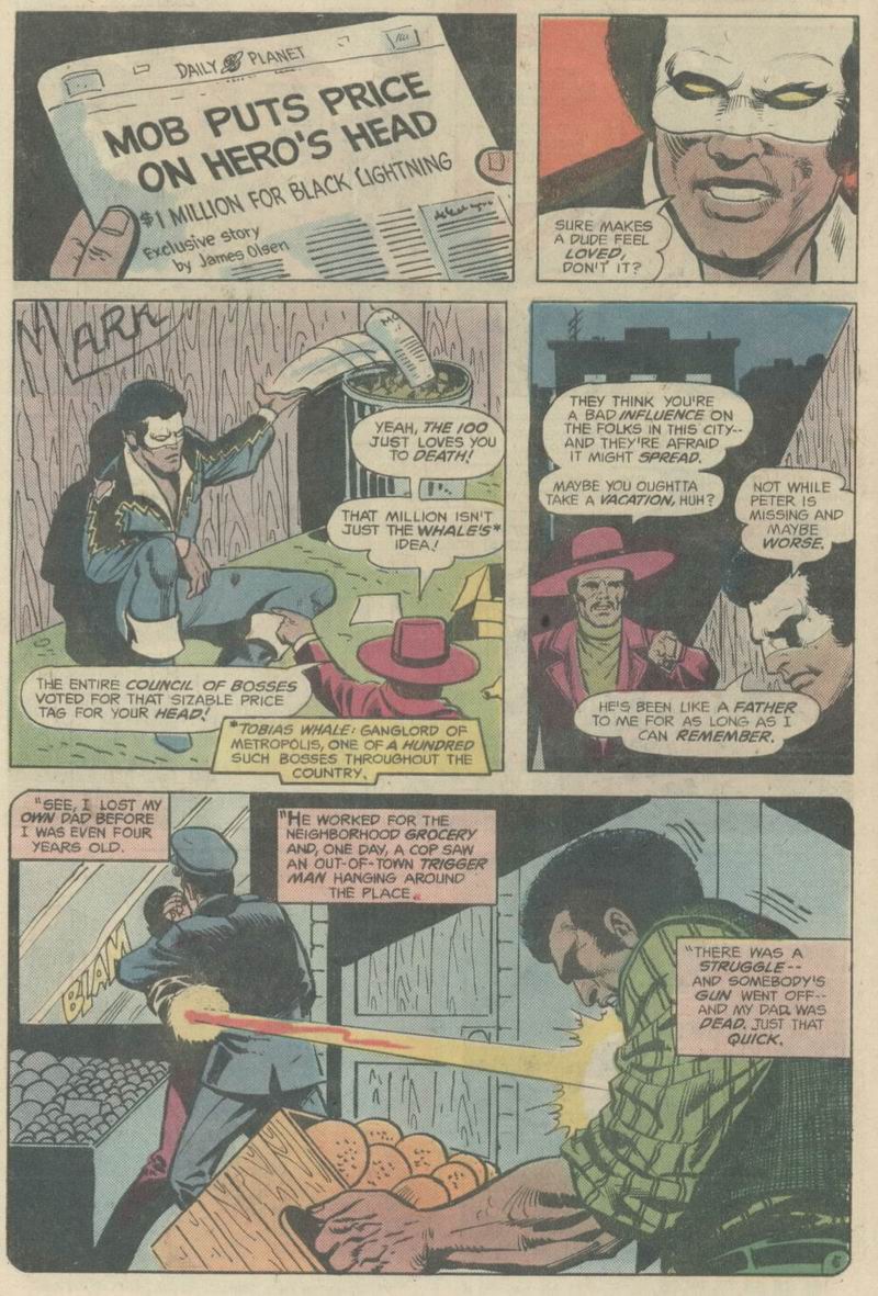 Instead, he’s awoken some time later by his informant friend Two-Bits Tanner. Tanner informs Lightning that crime lord Tobias Whale and the 100 have put a price on Lightning’s head. Tanner tells Lightning that he should lay low, but Lightning can’t do that while Peter is missing, and we get an extended flashback to his early days and upbringing in Suicide Slum. After his father was killed, Peter Gambi became a surrogate to young Jefferson Pierce, so he won’t abandon him now.
