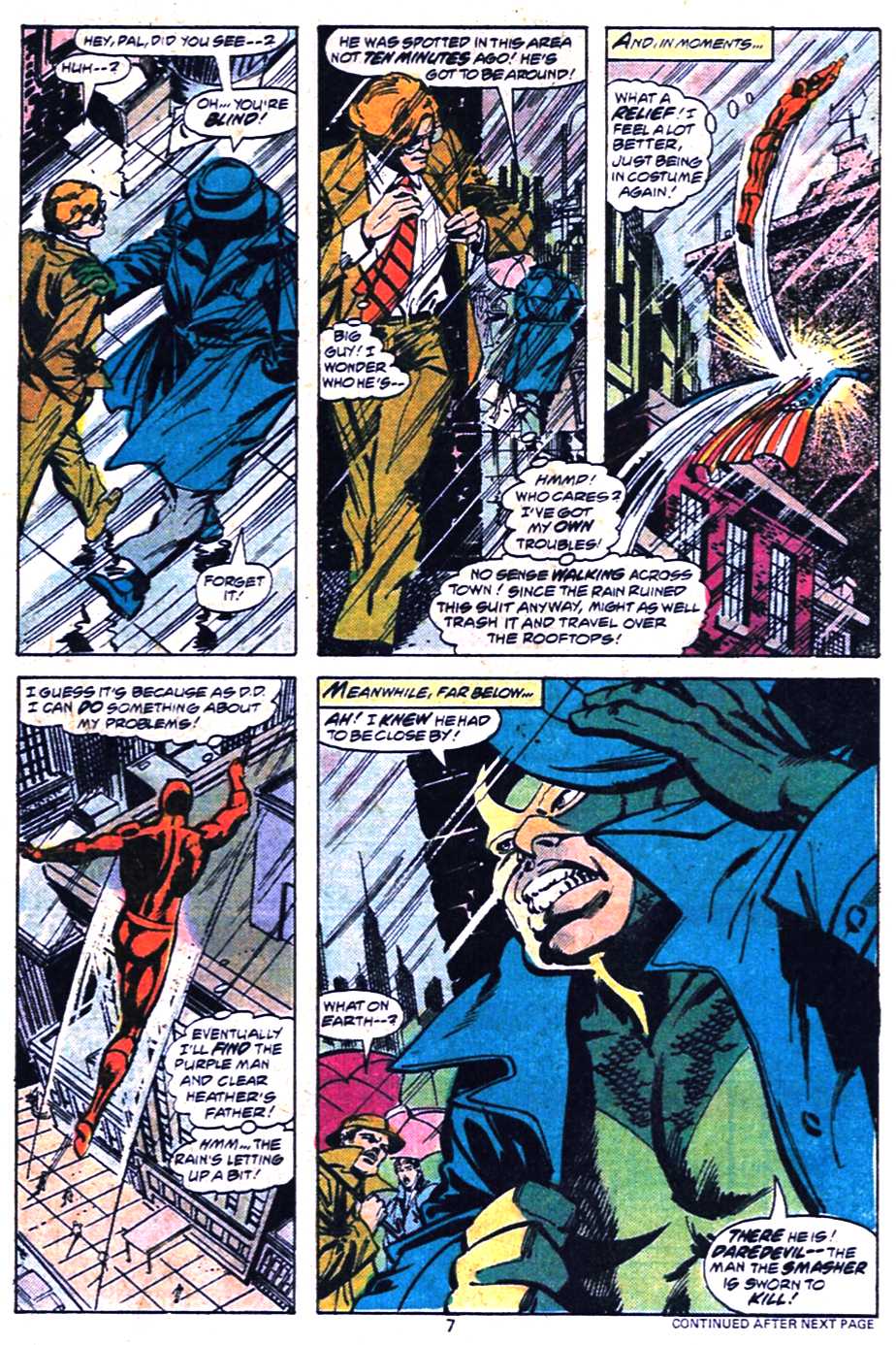 The issue opens with Daredevil making is way through the rain to his girlfriend Heather Glenn’s apartment. In the preceding installment, Matt Murdock had failed in defending Heather’s father Maxwell, who had been framed by the mind-controlling Purple Man, and was now facing incarceration. Distraught, Heather is planning on leaving town, and nothing Matt tells her can dissuade her–least of all the fact that he cannot conduct her father’s legal defense because he’s going to need to appear on the stand as a witness as Daredevil. Curse you, secret identity!