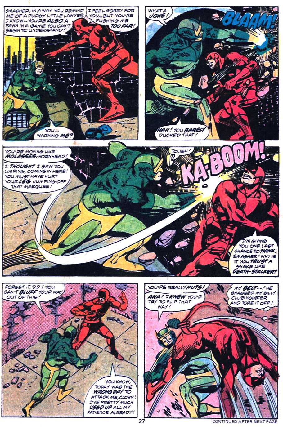 Heading back out, Matt becomes Daredevil again to clear his head–and as he makes his way across the city, he is attacked by the Smasher, a super-strong costumed villain sent to kill him by his old foe Death-Stalker. The two fighters battle it out for a couple pages, Daredevil’s greater skill and superhuman senses being more than a match for the Smasher’s strength. And ultimately, having the Smasher on the ropes, Daredevil quits the fight, seeing no point in it.