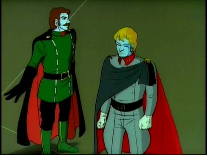 Desslok and his aide Talan are cooling their heels in Zordar’s throne room awaiting their audience. As his gaze falls upon Desslok’s throne, the Leader thinks to himself, “Someday, that will be mine.” It’s a sentiment that was added in entirely in STAR BLAZERS and isn’t present in the original YAMATO 2 source material. Before meeting with Desslok, Invidia lines up an ally in General Dire, who has similarly been concerned about the influence Desslok has been gaining with the ruler of the Comet Empire. So he needs to be put out of the way. Together, the two go to confront the Gamilon leader.