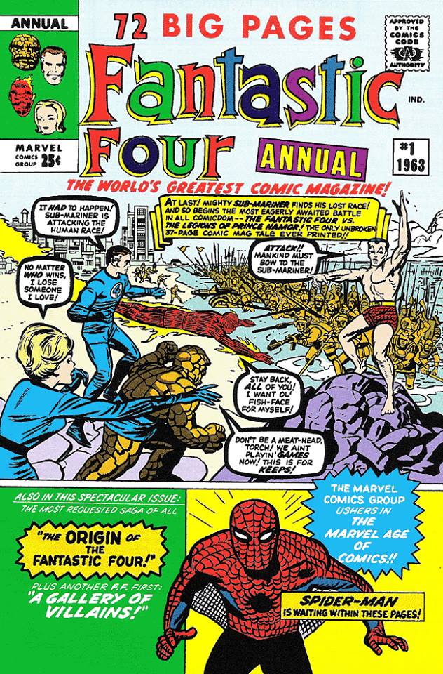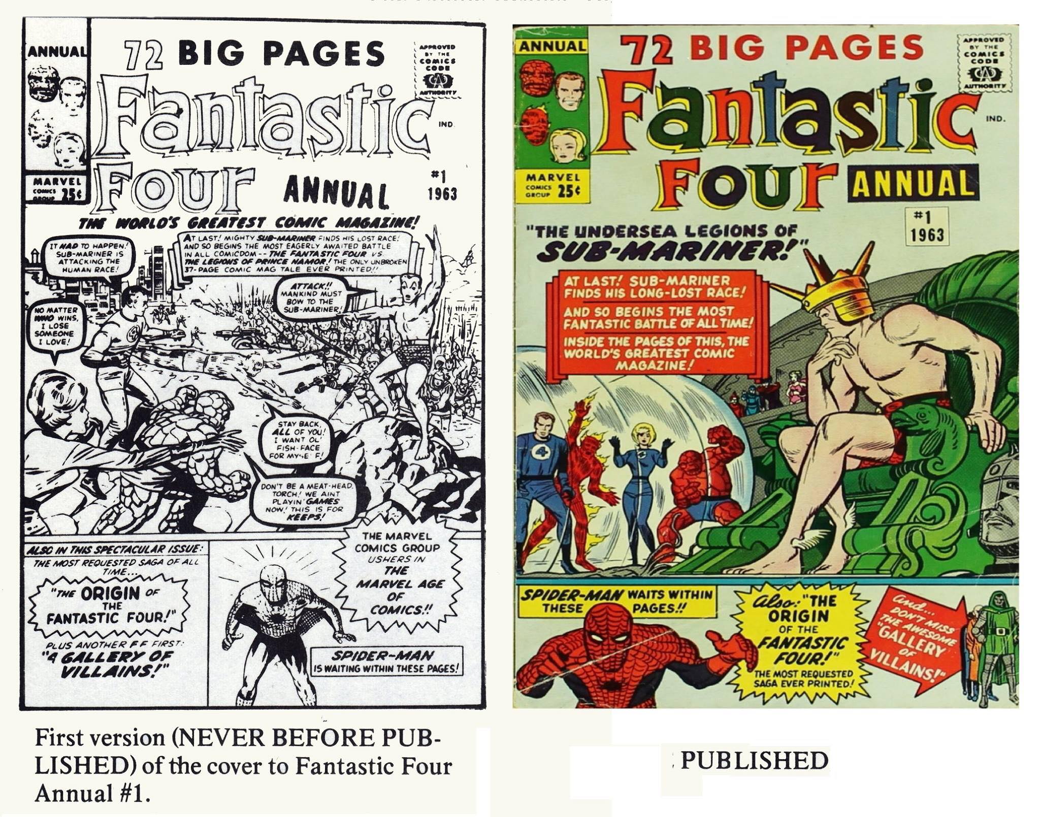 FANTASTIC FOUR ANNUAL #1 had been prepared a number of months earlier, at around the time of AMAZING SPIDER-MAN #4. As part of his larger promotional campaign for the burgeoning Marvel line of characters, editor Stan Lee chose to spotlight Spider-Man in this oversized issue of his best-selling series. Even on the preliminary, unused cover, Spider-Man is called out prominently–and his figure was even increased in size at some point before the decision was made to use a different piece entirely.