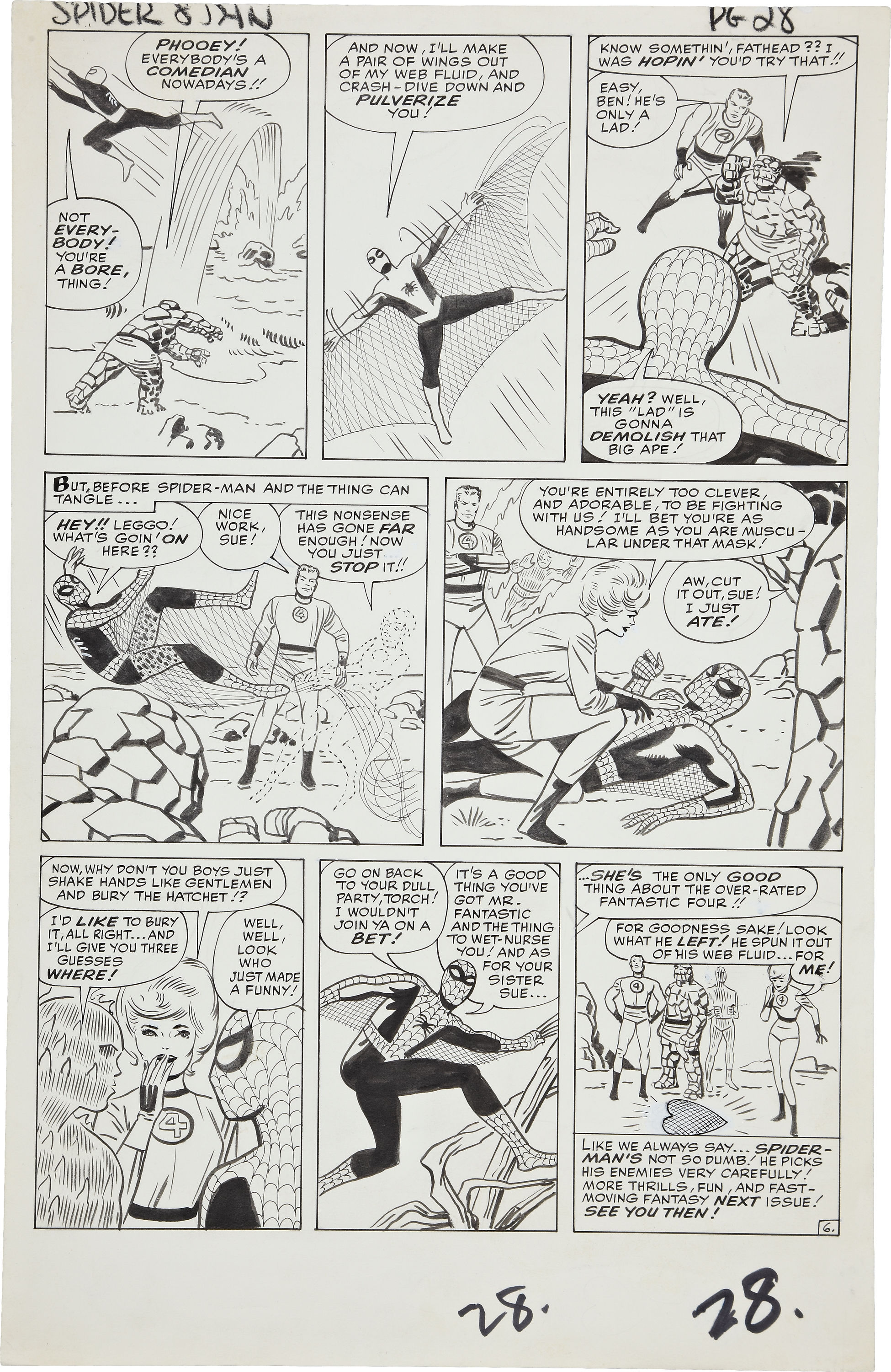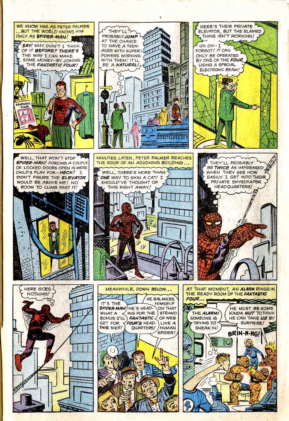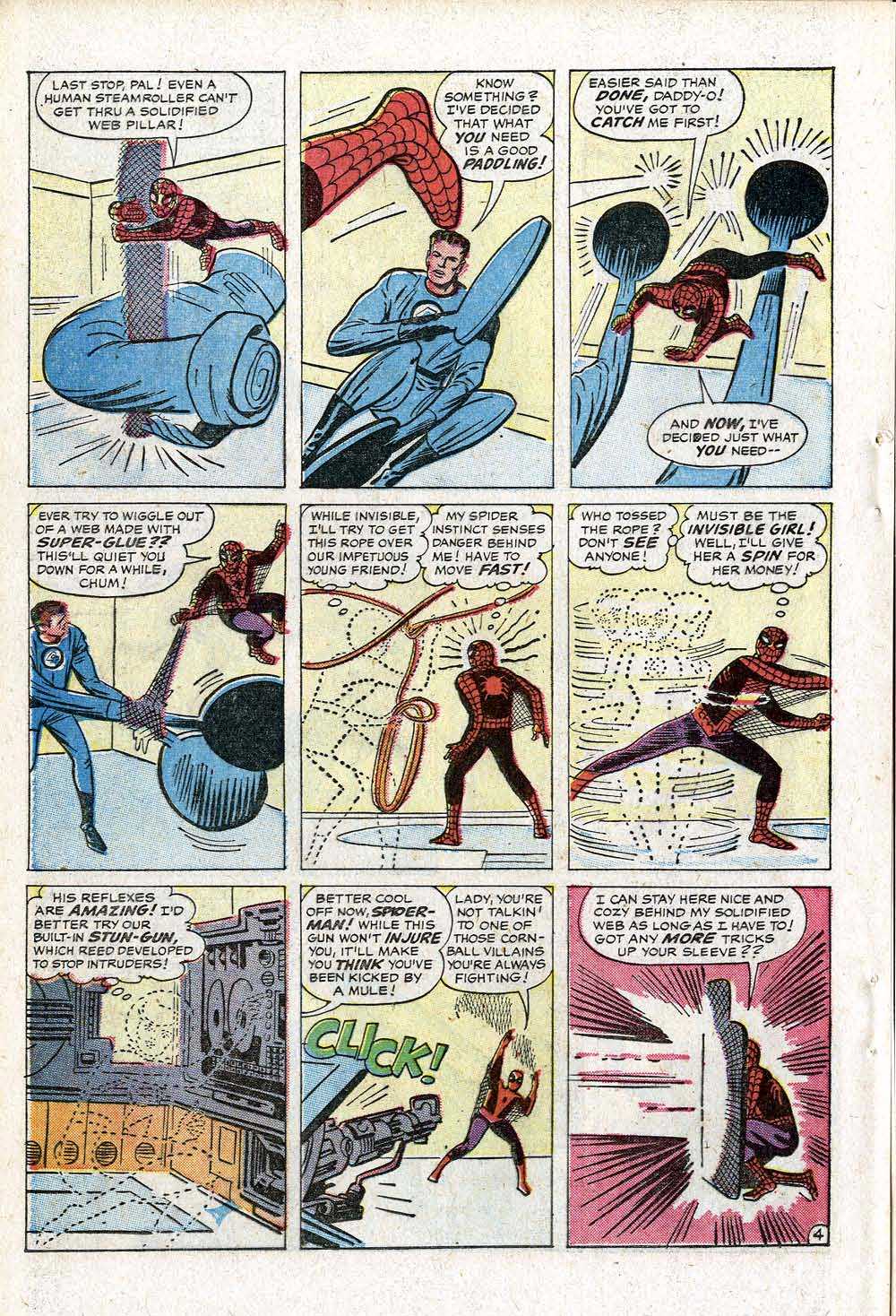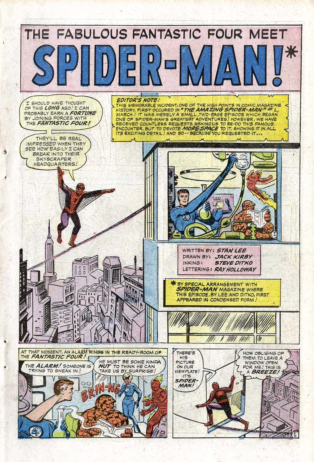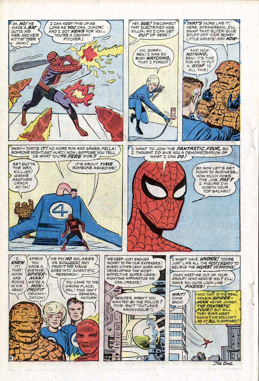 The biggest clue I had was that the story was only 6 pages long–shorter than a typical HUMAN TORCH solo adventure in STRANGE TALES, shorter than most of the stories being produced at this moment, in particular the super hero tales. But there was one other 6-page story that fit both the timeframe and the bill–and that’s the short Spider-Man meets the Fantastic Four story in FANTASTIC FOUR ANNUAL #1.