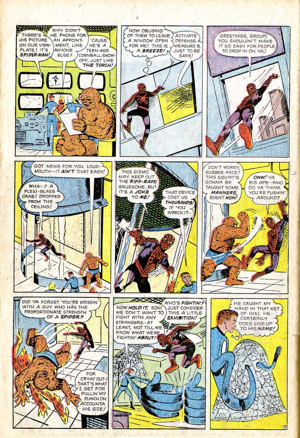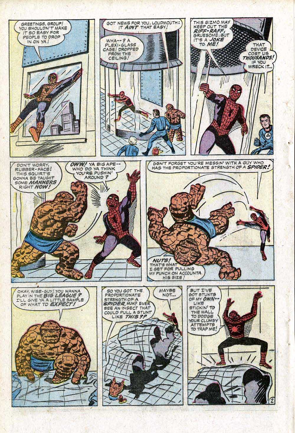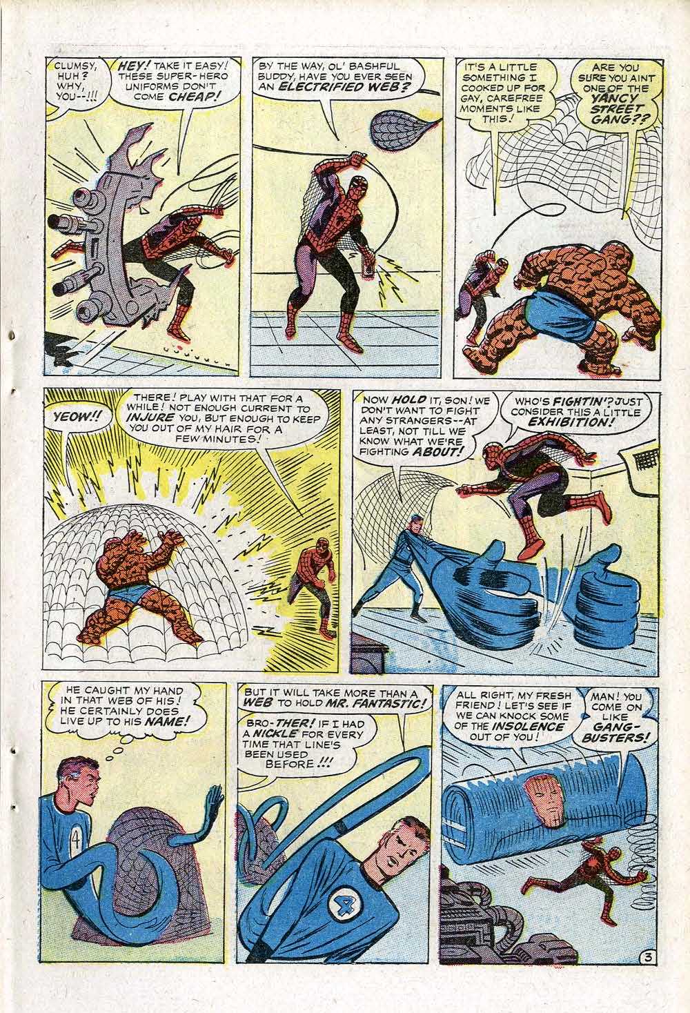 Looking at the two stories side-by-side, it’s clear that the one from AMAZING SPIDER-MAN #1 came first. Some of Kirby’s choreography on the later story doesn’t quite add up properly (Reed being freed from Spidey’s web by an otherwise-calm Thing and them stretching himself into a wall to hold an irate Thing back, for example.) And really all the story does is to create more action in that earlier encounter. And I suspect that’s the key to why it was done.