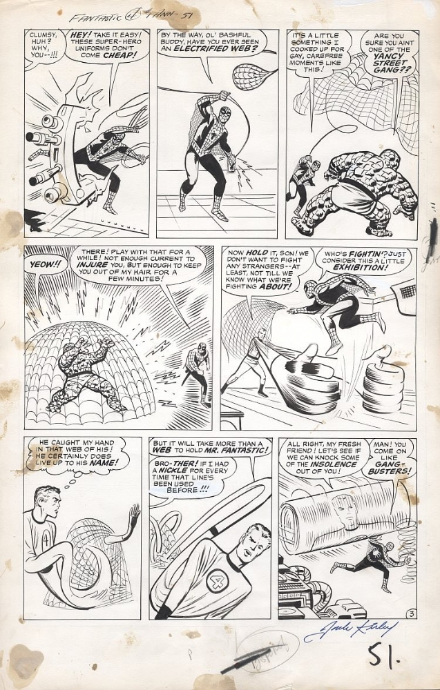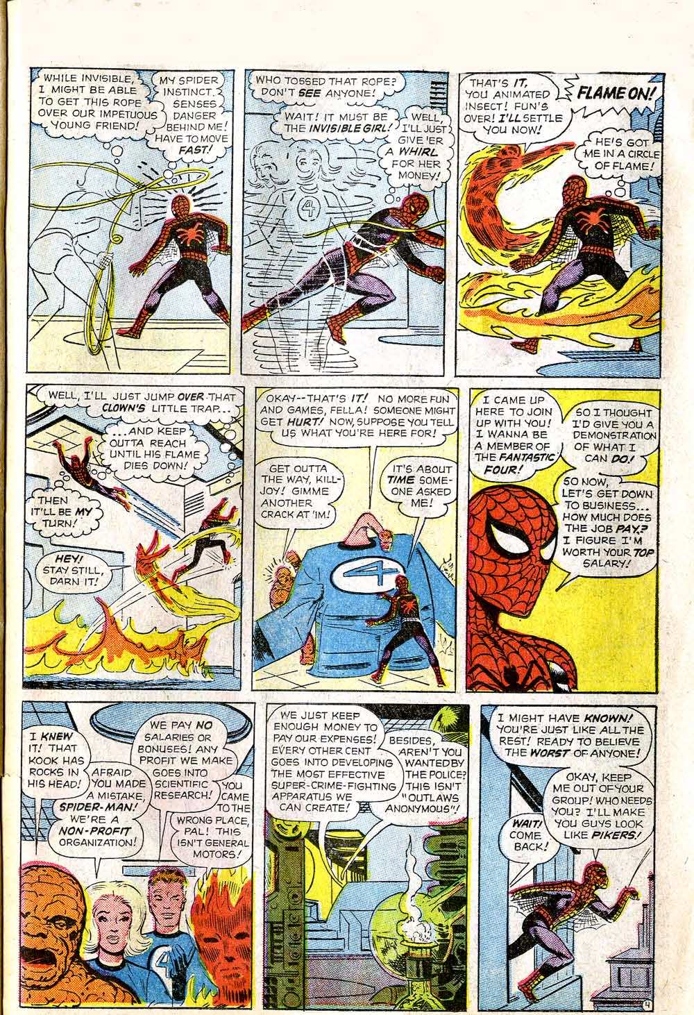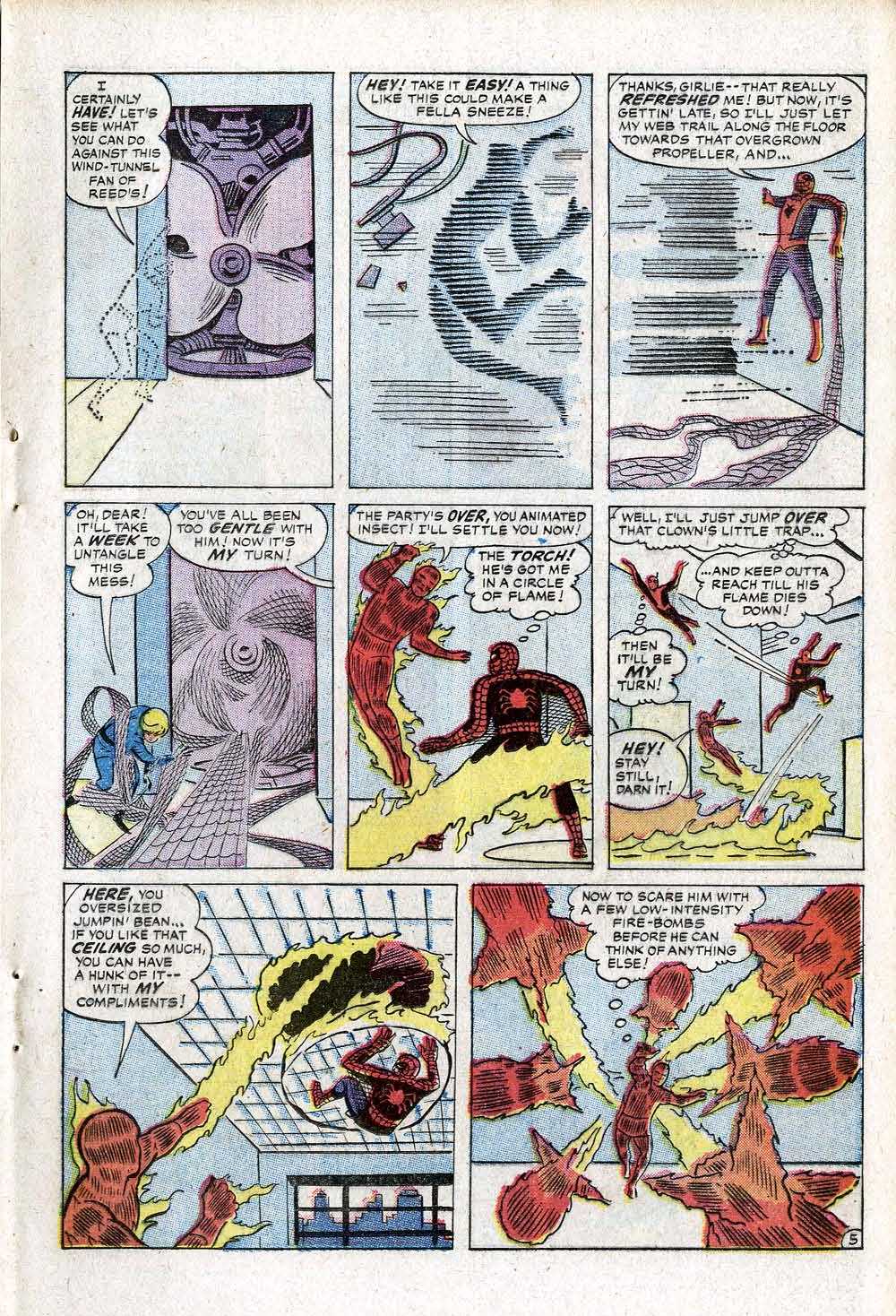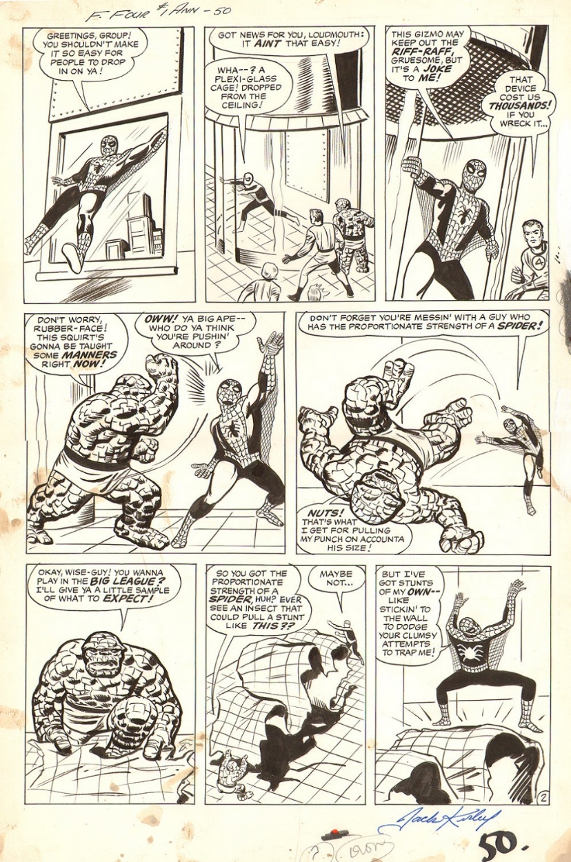 Stan wanted to do a story spotlighting their new character Spider-Man in the Annual, and Kirby went off and plotted and penciled the six-page tale that would become SPIDER-MAN TACKLES THE TORCH for that purpose. In the meantime, Lee began to get feedback on AMAZING SPIDER-MAN #1–whether this came in the most obvious form of the fan mail that he was soliciting, or in-person reactions from fans he encountered, or a mix of the two, I couldn’t say. But in whatever form it came, the message got back to him that the readers felt that they had jobbed out the Fantastic Four in ASM #1 in order to make Spider-Man look cooler–there was no way that a scrawny runt like Spider-Man should be so easily able to take on the entire Fantastic Four!