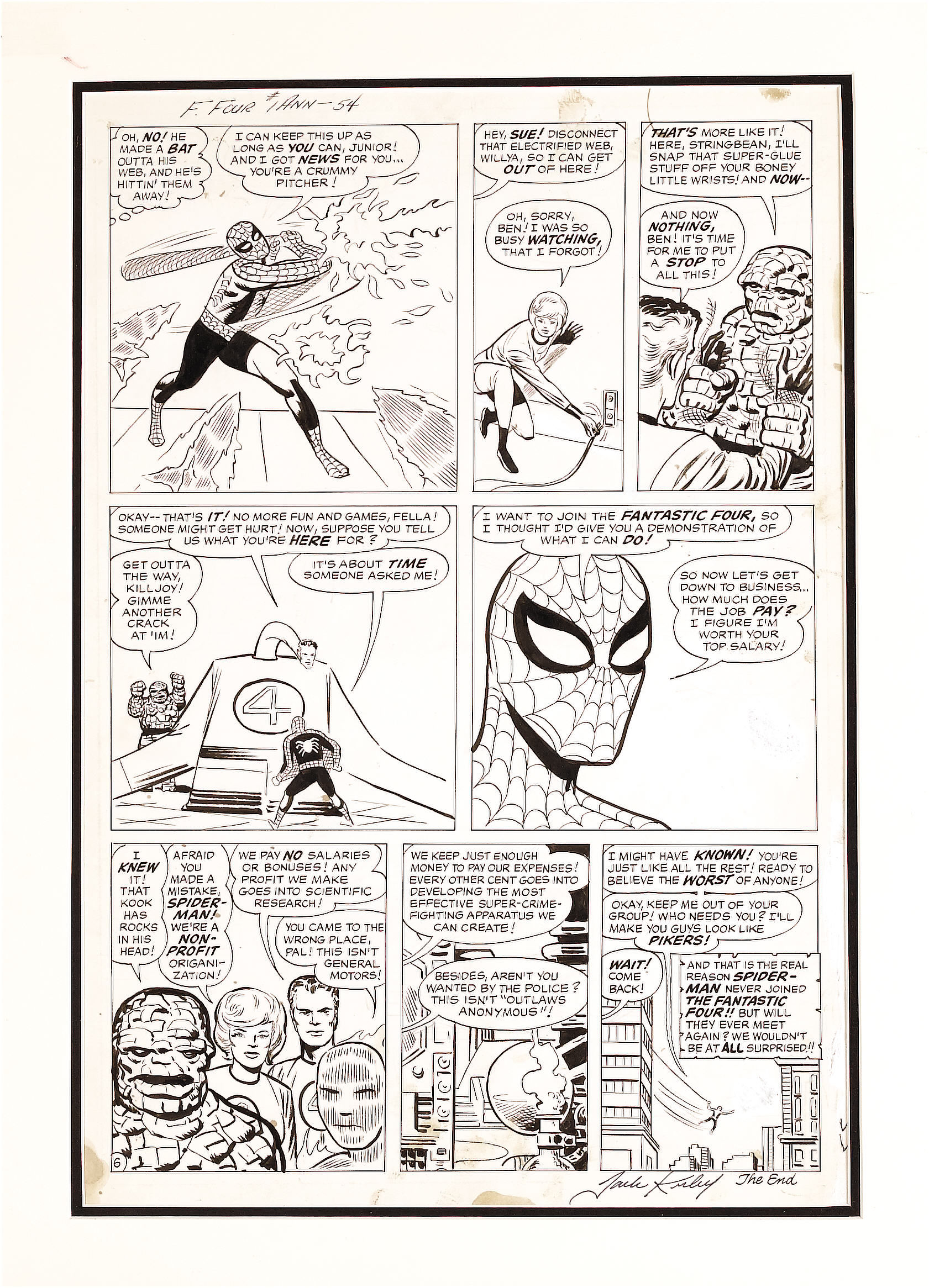Later, wanting to use the six pages Kirby had drawn rather than simply discarding them, Lee decided to script them to run in an issue of AMAZING SPIDER-MAN. Again, Ditko would ink the pages. It’s possible this coincided with some greater demand on Ditko’s time, which would have made the loss of six pages a boon rather than a hardship. But it’s just as likely that it’s just a decision that was made regardless. It’s pretty clear that SPIDER-MAN TACKLES THE TORCH was scripted as a Spider-Man story, even though Spidey plays more as the antagonist in it. The original art board mark-ups also match those of the lead story in ASM #8, so if this was the case, the story was never labeled as part of FF ANNUAL #1, it was simply put to the side.