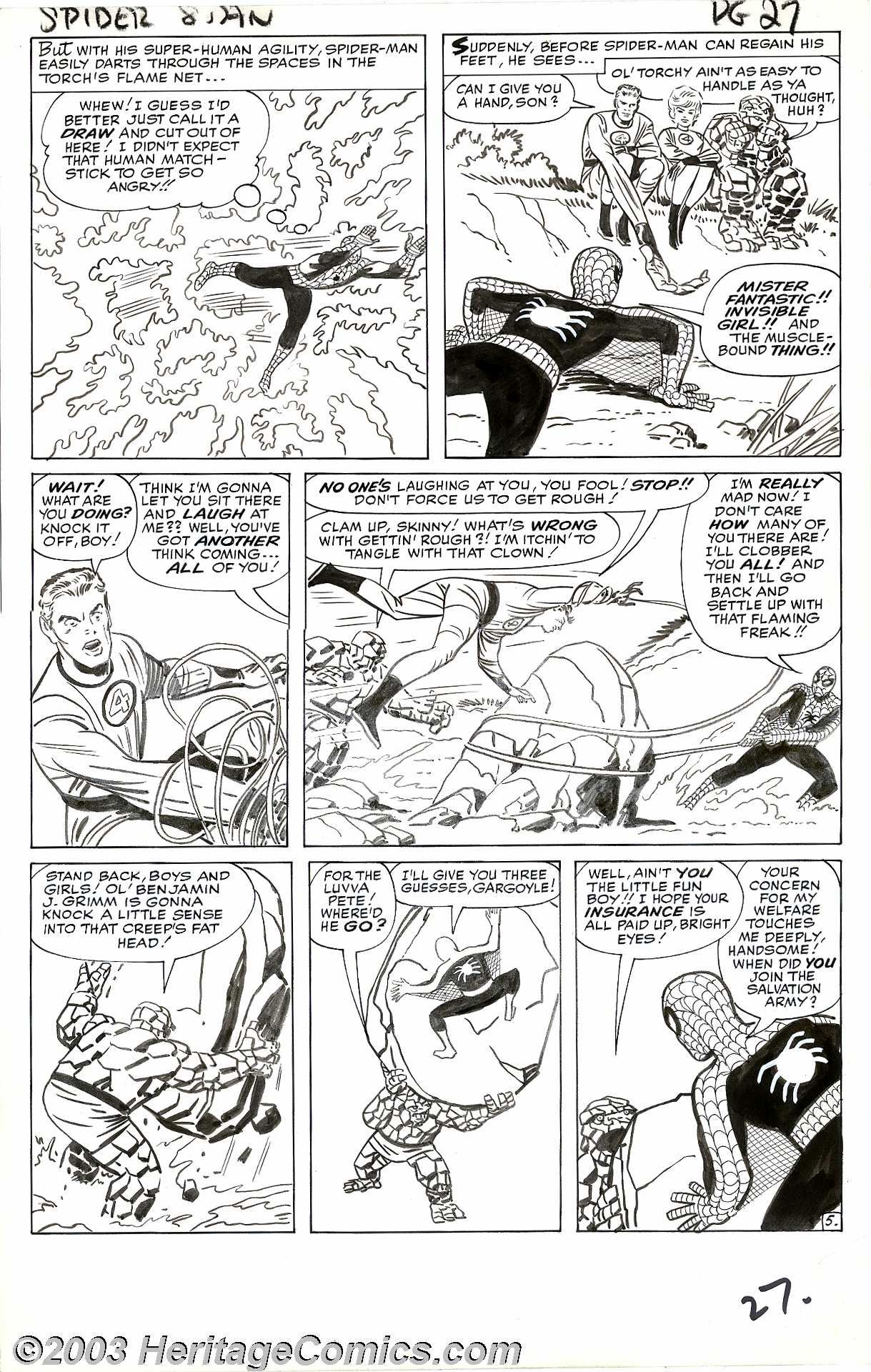 So when Kirby brought in the pages for the FF ANNUAL, Lee told him about a change-of-plans. Rather than the new story that Kirby had drawn, Lee wanted to take that earlier encounter from ASM #1 and expand it into a full 6-page battle epic, one that would show the full array of the Fantastic Four’s abilities while still maintaining Spider-Man’s victory. This, he hoped, would placate the fans. Taking a copy of that story from ASM #1 with him (probably in the form of a printed copy of the book) Kirby proceeded to draw the replacement story for FF ANNUAL #1. Ditko was brought in to ink it, to help preserve the look of Spider-Man and the consistency (as he would also do for the longer Human Torch/Spider-Man team-up in STRANGE TALES ANNUAL #2 at around the same time.)