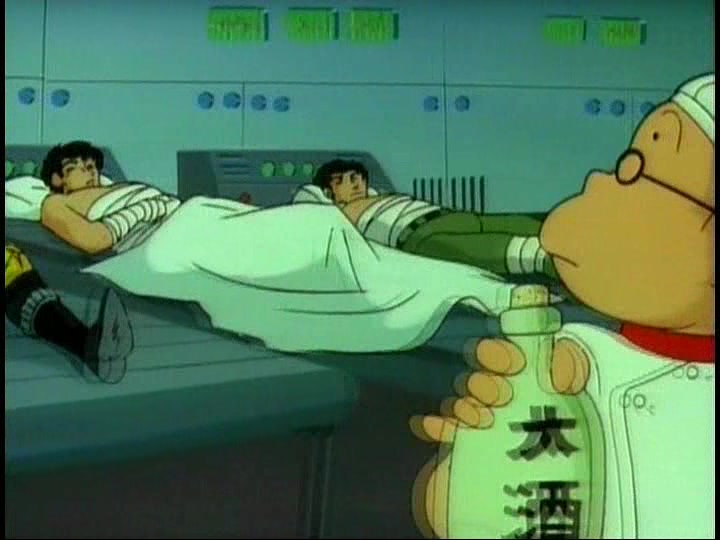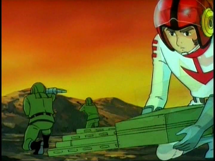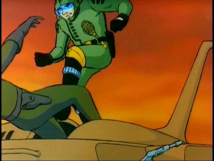 Knox and his marines come storming over the hill brandishing grenades. Their favorite tactic, it seems, is to leap onto an approaching tank, force the hatch open, throw in a live grenade and then leap away before the whole thing explodes. This is all done pretty bloodlessly in STAR BLAZERS, far less so in the YAMATO 2 source material–this whole sequence is swiss cheese and it’s remarkable that it flows as well as it does with all of the tiny cuts that are being made. At one point, Knox leaps atop another tank, this one whose commander is standing in the hatch. Kicking him off the tank, Knox proceeds down into it, throwing two more men out of it and commandeering it. “Okay, you robots!” Knox cries as he hurls the men out of the vehicle to make sure that the American audience doesn’t think that he’s hurting any real flesh-and-blood people (He is.) “Boy, can they fight!” whistles Wildstar as he and Sandor put the finishing touches on their missile weapon.