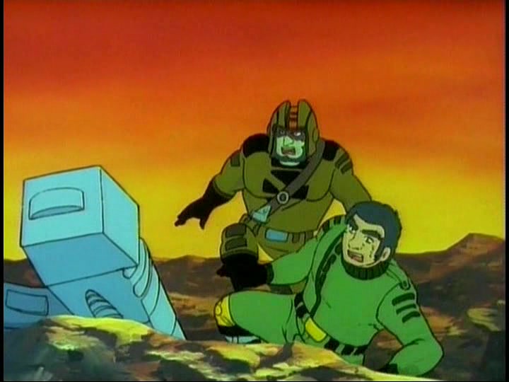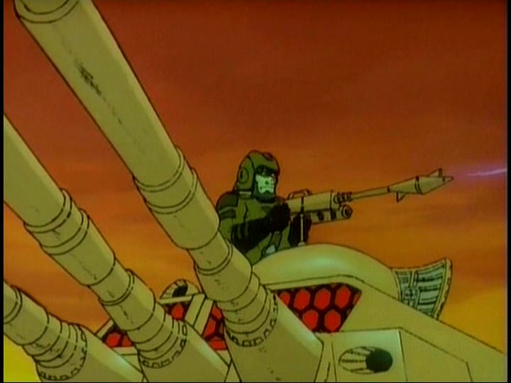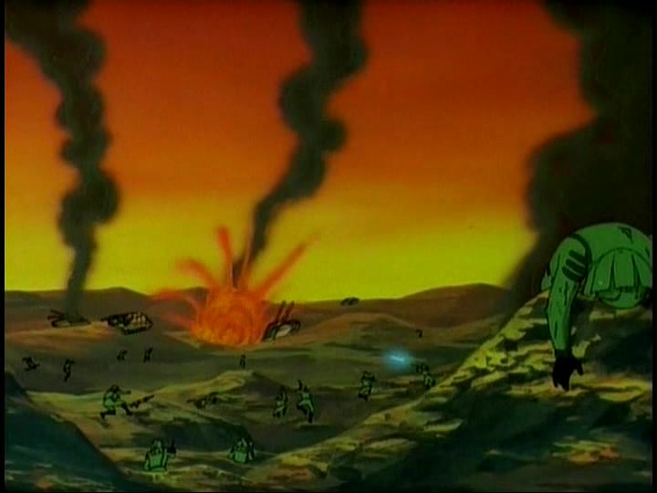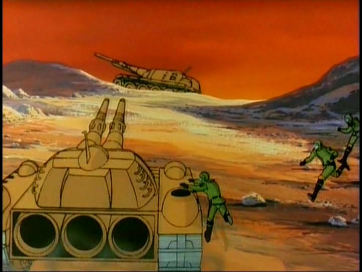 The episode opens with the space marines still under siege by General Scourge and his battalion of “robot tanks.” Wildstar, Sandor and IQ-9 arrive with heavy ordinance, but they need five minutes to set it up. In order to buy them this time, Knox orders his men to charge the enemy tanks. “We’ll keep them away from this position, you get the missile launcher ready! We’ll keep them real busy!” There are a ton of small edits in here where marines are getting blown to bits by the attacking tanks.