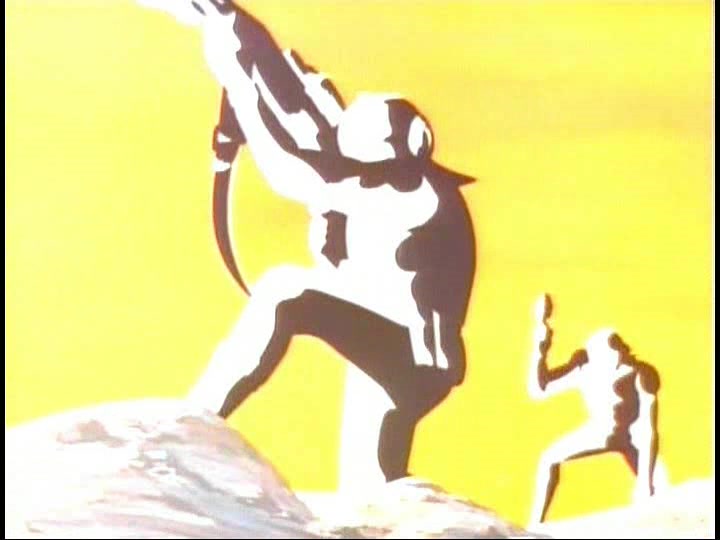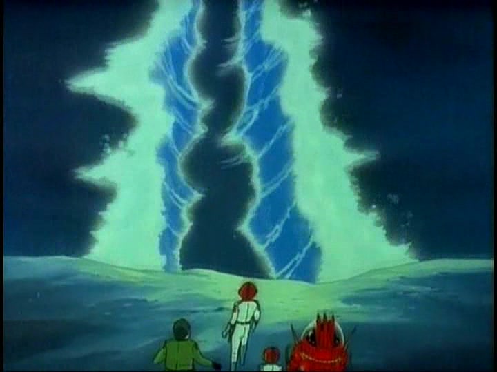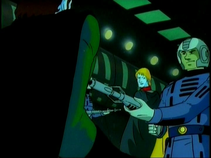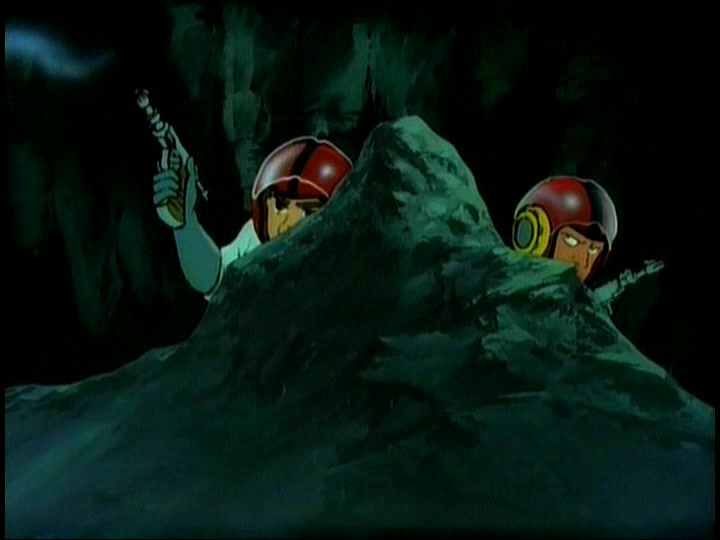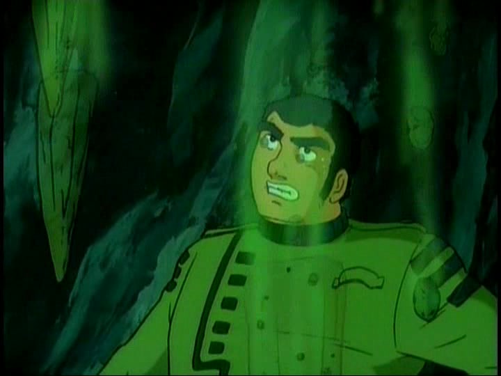 Back at the Argo, the Star Force receives another message from Trelaina, giving them further information about her location. She seems especially eager to meet Mark Venture, a fact that causes Homer to give Venture a bit of a hard time. There’s another sequence here that’s trimmed in STAR BLAZERS, where the intercom notifies the rest of the crew that the landing party is expected to locate Trelaina shortly. In the medical bay, working on the wounded, Doctor Sane would really like a drink, but Nova keeps him on task. Bits of this scene are in STAR BLAZERS, but the intent is all different. Homer relays the information down to Wildstar and the ground team, who make their way into a series of underground passageways. But the caves are guarded by Comet Empire soldiers. (Or, as Wildstar says unconvincingly, “They’re robots!” )