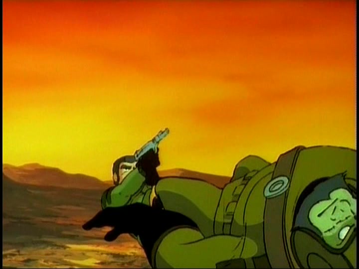 As Wildstar, Sandor and IQ-9 take off, their shit is fired upon by Scourge in his tank. But Knox is upon him, and plays a game of cat-and-mouse until he can get close enough to jump the Comet Empire commander, causing them both to tumble from the tank. Scourge pulls out his sidearm and almost shoots Knox in the head, but the marine’s survival instincts kick in and he knocks the gun from the enemy’s hands. The pair engage in a brutal and desperate struggle to regain the firearm until Knox gets the upper hand, pressing the weapon to Scourge’s chest and blowing a huge hole through his body. There wasn’t any way to disguise any of the violence here with talk of “robots” so it all had to go.