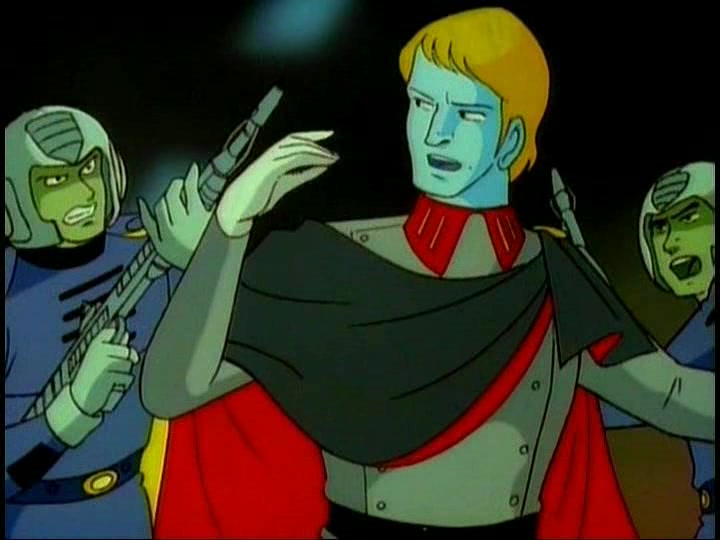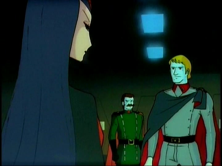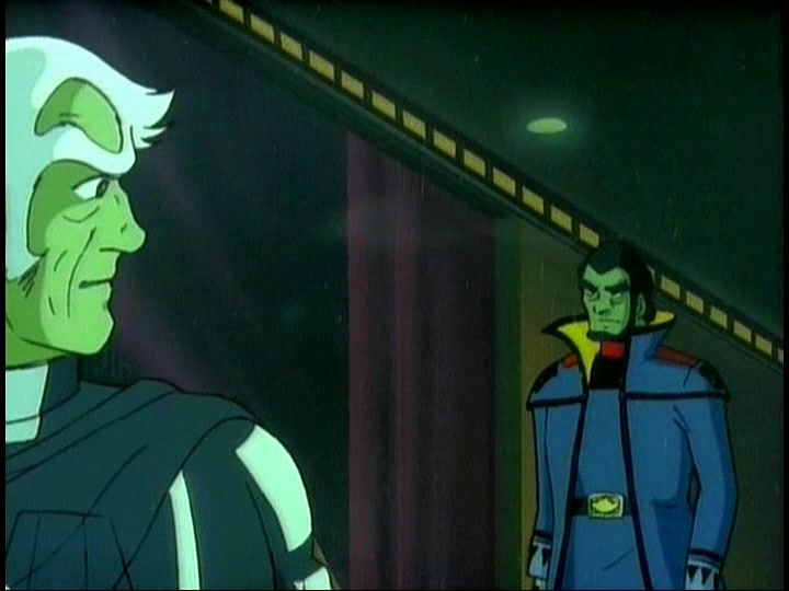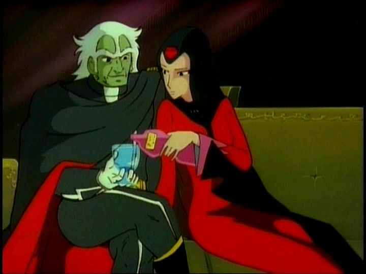 But when Desslok turns to depart, Invidia signals her men to have him arrested. He’s too great a threat, both to the Empire and to her own position within it. Meekly, Desslok accepts the situation. “You don’t need your guns. I won’t run away. I’m not going to be shot escaping.” He tells his aide Talan that he is in charge of the Gamilon fleet now, and that their time will come, before he is escorted to solitary confinement. Later, Invidia spins a web of lies for Prince Zordar (and being a bit creepily erotic towards him to, being his daughter–in YAMATO 2, she’s his consort, which makes the body language make a bit more sense.) She tells Zordar that Desslok broke down at the very mention of Trelaina’s name.