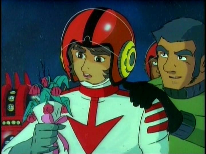 Down on the ground, the enemy is regrouping as Trelaina watches the conflict from the safety of her hidden citadel. “Once again, Telezart has become a battlefield.” she anguishes, sinking to her knees in seeming prayer. By this point, Sandor and IQ-9 have the Multi-Head Missile Launcher set up, and giving Knox a minute to retreat in his stolen tank, they fire it at the enemy forces, wiping them out. We even see a tank crewman struggle to the hatch before his tank explodes underneath him–which is perhaps why IQ-9 is given the line, “Hey, robots, that’ll reprogram you!” Only the lead tank, manned by General Scourge, remains, and Knox pursues it as it retreats into the distance. The Medical Shuttle arrives, and Nova is able to pass her flowers over to Wildstar before he, Sandor and IQ-9 head out in search of the cave where Trelaina said she was located in her last message. And that’s where STAR BLAZERS goes to a commercial break.