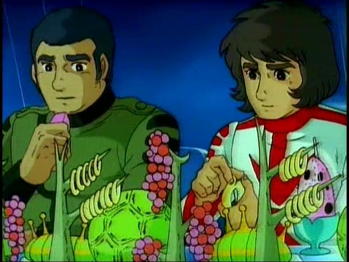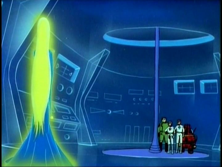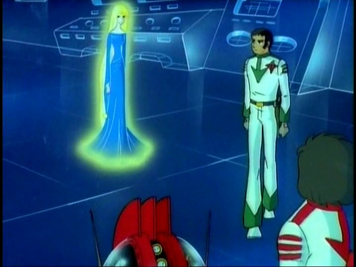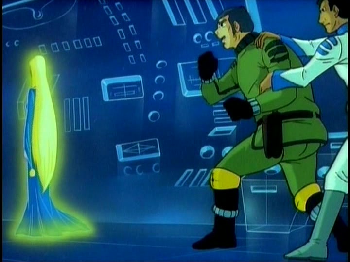 The episode opens on board the Argo, as Doctor Sane is giving Mark Venture a haircut in preparation for his meeting with Trelaina–now that the area has been secured, he’s going to journey down to the surface to rendezvous with Wildstar and the rest of the landing party. Despite the fact that he’s never met Trelaina in person yet, Venture clearly has it bad for her. Nova gives Venture a boutonniere she’s made for his lapel. There’s a bit cut out of STAR BLAZERS where Venture gets to his landing craft only to discover that the hold is filled to the brim with Royster and dozens of other crewman who also want to go to the surface and hit on Trelaina.