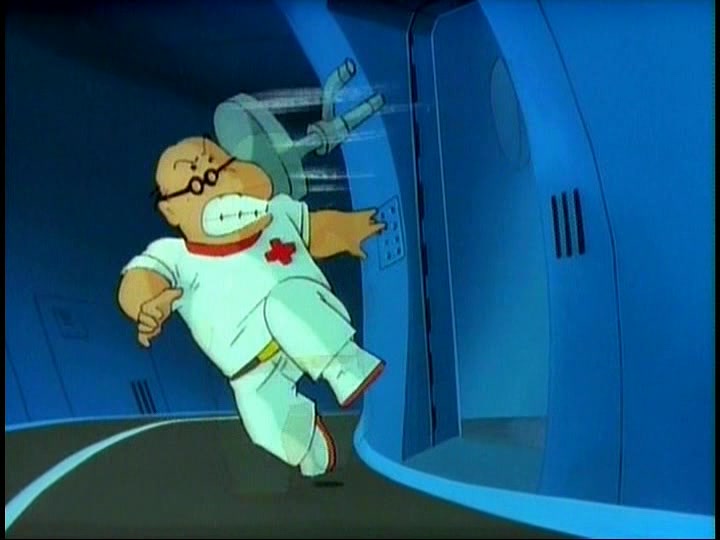It’s so intense, in fact,t hat Doctor Sane gets beaned by a flying stool as he passes by in the corridor, followed by the whole table. Sane tries to get them to stop, but they’re both too far gone, and they’re both a bit of a mess when he’s finally able to drag them up to the bridge. After Homer asks him if Trelaina is going to help them, he’s forced to confess that se hasn’t changed her mind. “Boy, it was sure a wasted trip!” grouses Dash, “Why didn’t she put that bit of information in one of her messages?” Knox is happy to point out to Venture that he’s not the only one who feels that way.