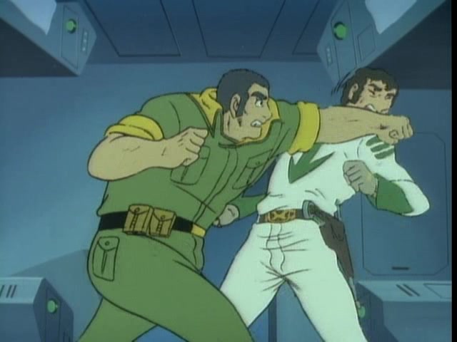 Returning to the Argo, Venture is immediately taunted by Hardy as he crosses the flight deck for his inability to sway Trelaina with his charms. Hardy lets slip that Sergeant Knox told the crew all about it, and Venture, pissed off, goes to confront the sleeping Sergeant in his quarters. “Oh, hey, Venture, did miss stuck-up tell you to get lost? Look, fella, dames like that ain’t worth worrying about!” Unsurprisingly, this turns into a full-scale brawl between the two men–one that STAR BLAZERS, as usual, cuts all of the most brutal bits out of. But its still pretty intense for such a fight.
