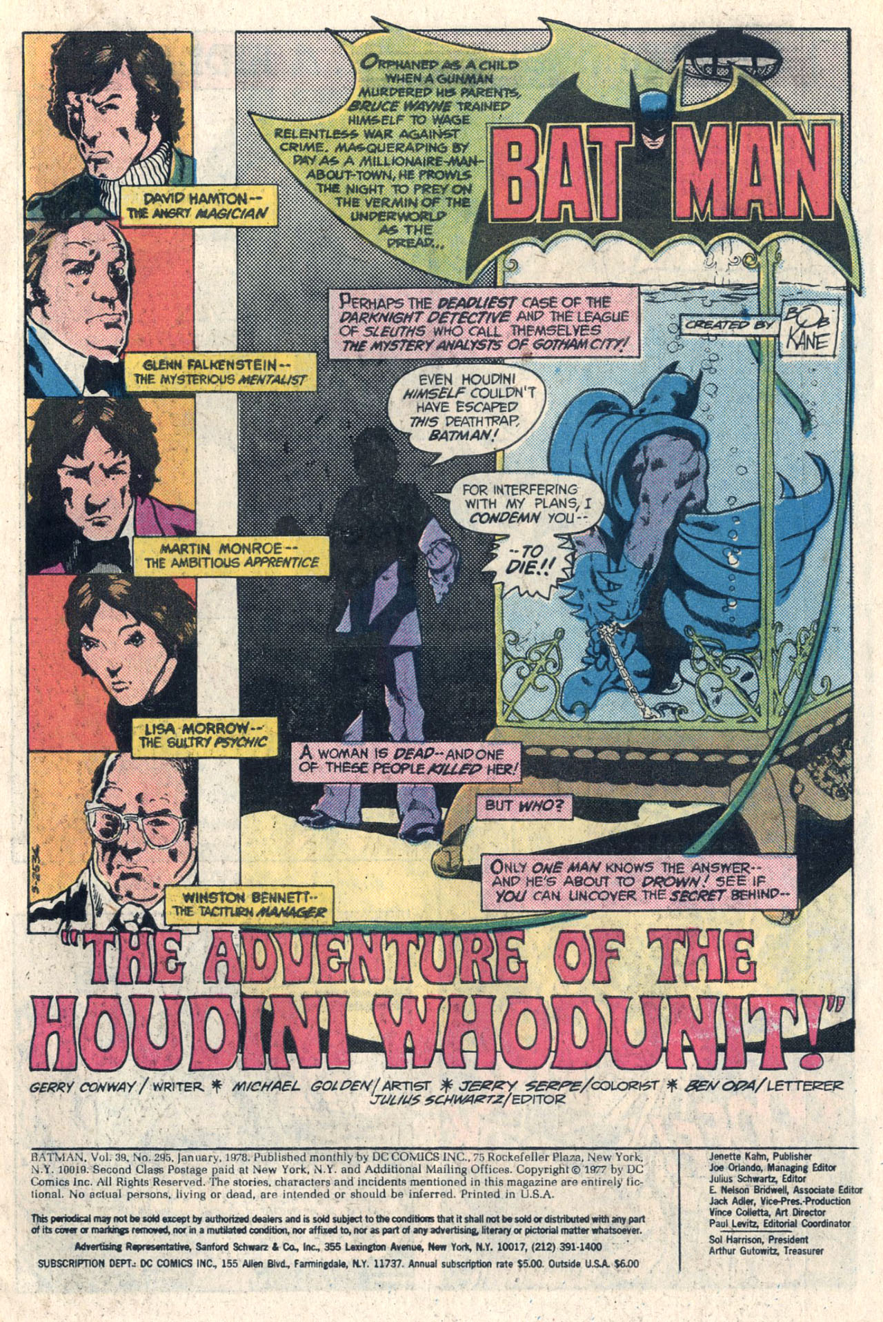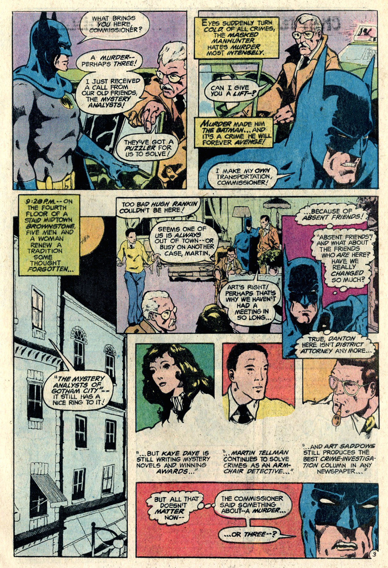 The story opens on action, with Batman waylaying a gang of criminals pulling a late night heist. Commissioner Gordon shows up in the aftermath, and tells the Darknight Detective that the Mystery Analysts of Gotham are working on a mystery–a murder–and would like his assistance. The Analysts had been introduced back in the 1960s, but they hadn’t been seen in many years. Writer Gerry Conway limits their numbers here to three, wisely.