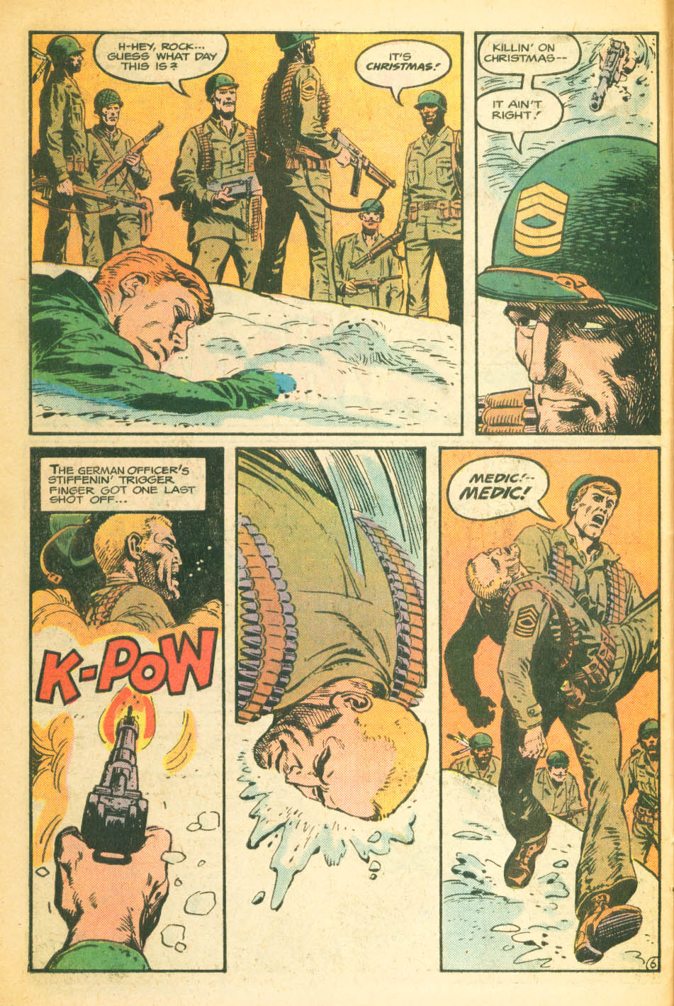 The story concerns three separate hills that Easy Company is tasked with capturing in three different campaign. It opens with the Combat-Happy Joes fighting in North Africa to claim Fryin’ Pan Hill, which they do–but not without a ton of casualties on both sides. Then, they’re in Italy, charged with taking Santa Claus Hill in icy terrain on Christmas. Once again, they’re victorious, but not without the snow being stained by blood–and one wounded Nazi gets off a last shot that wounds Sgt. Rock himself.