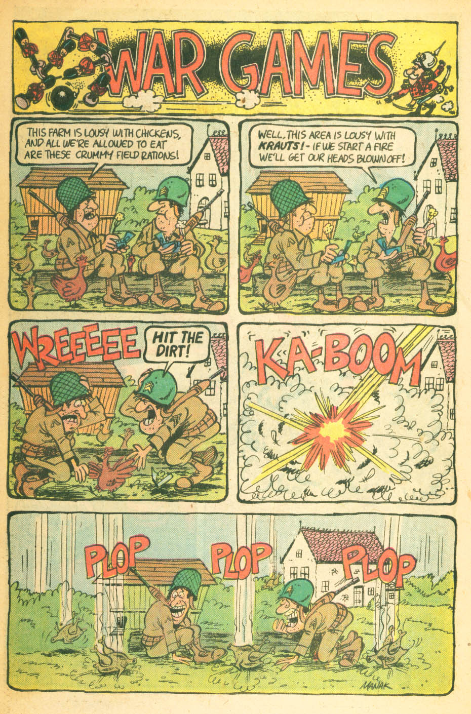 This is followed up by a single page comedy feature, a regular fixture in the Kubert war titles. This particular page is by Dave Manak, and it’s a simple enough gag. Clearly, Kubert thought these pages were of interest to his audience (or he simply liked Manak and wanted to kick him some work) but I don’t know if that was truly the case. I seem to think that the readers would have preferred to have the page devoted to a longer Rock story. But especially since the issues were all being produced and assembled concurrently, having these one-page fillers made for greater flexibility.