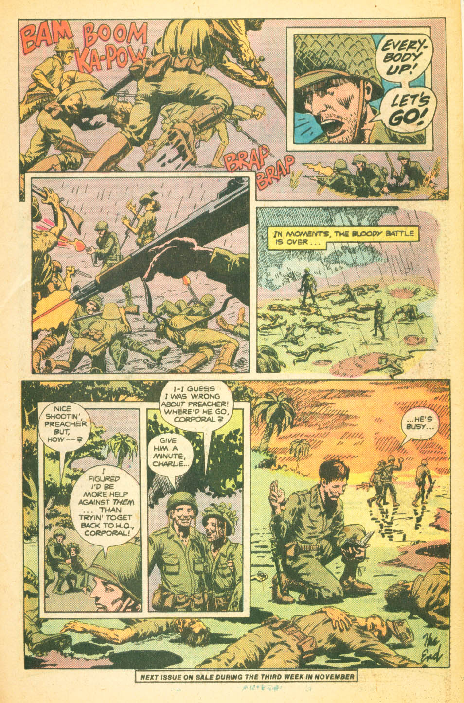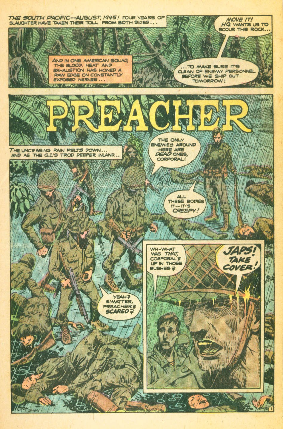 The story is a rote one. It’s the final days of the war, and a group of Marines are ambushed and pinned down by the Japanese. The only man who can be spared to try to break through and get word back to H.Q. about their plight is the company’s Preacher, who has been sneered at as a coward for his reluctance to fight. But of course, the Preacher winds up counter-attacking the enemy soldiers, liberating his unit and proving his valor–and then he kneels to pray over the bodies of his fallen foes.