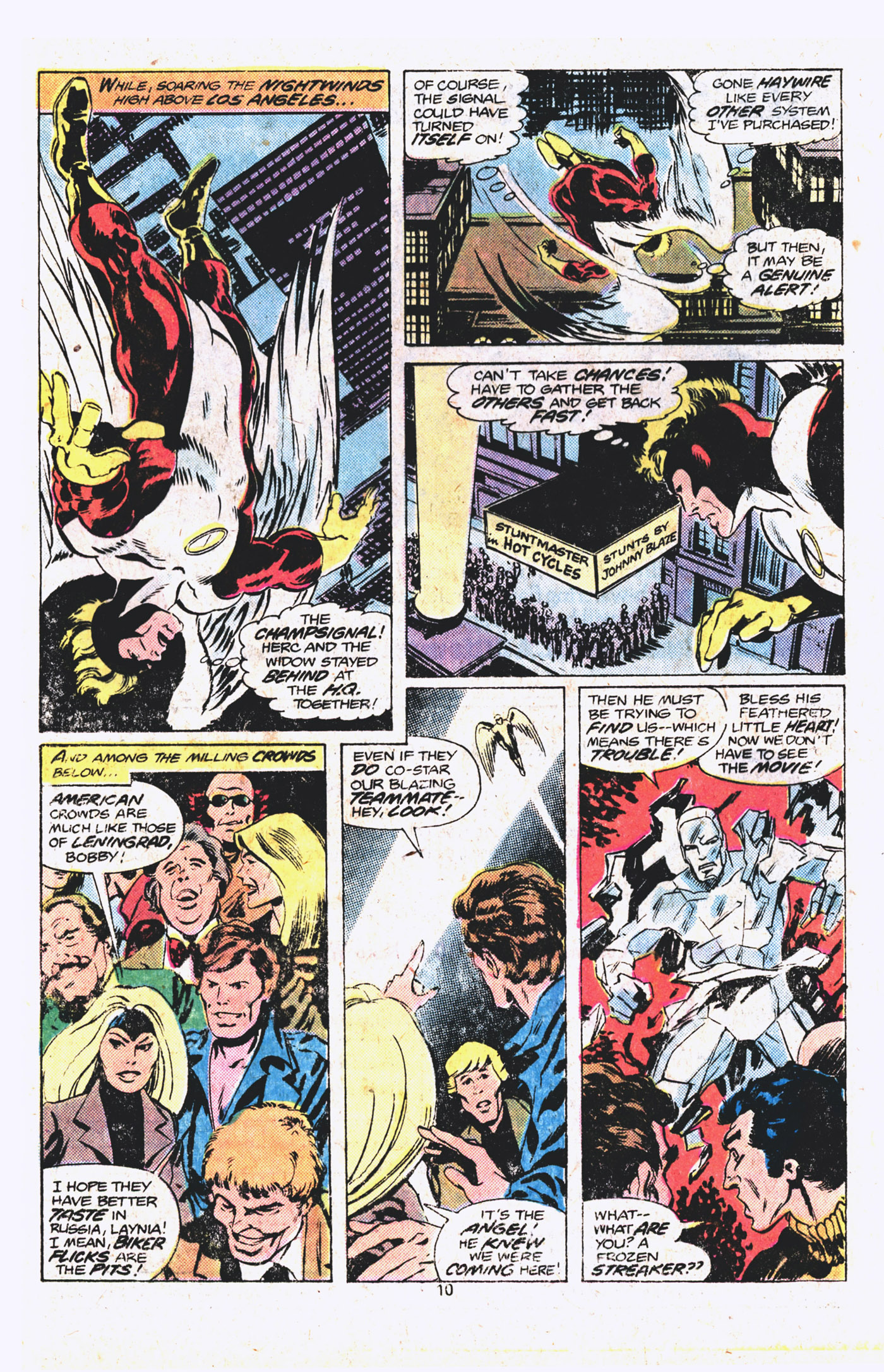 The Black Widow, though, is able to activate the Champs’ alert signal, in which the lights in their building form a giant C-pattern–think for a moment just how ineffective an alert signal that truly is. Fortunately, Angel happens to be flying by on his way to the premiere of the Stunt-master movie that Johnny Blaze provided stuntwork for, and he’s able to gather up fellow team members Ghost Rider, Iceman and hanger on Darkstar. The LA crowd is pretty pissed to discover there are mutants in their midst, underscoring the prejudice that created the Sentinels in the first place. Anyway, sniping at one another in the approved 1970s super-team style, the assorted heroes race back to the Champs building.