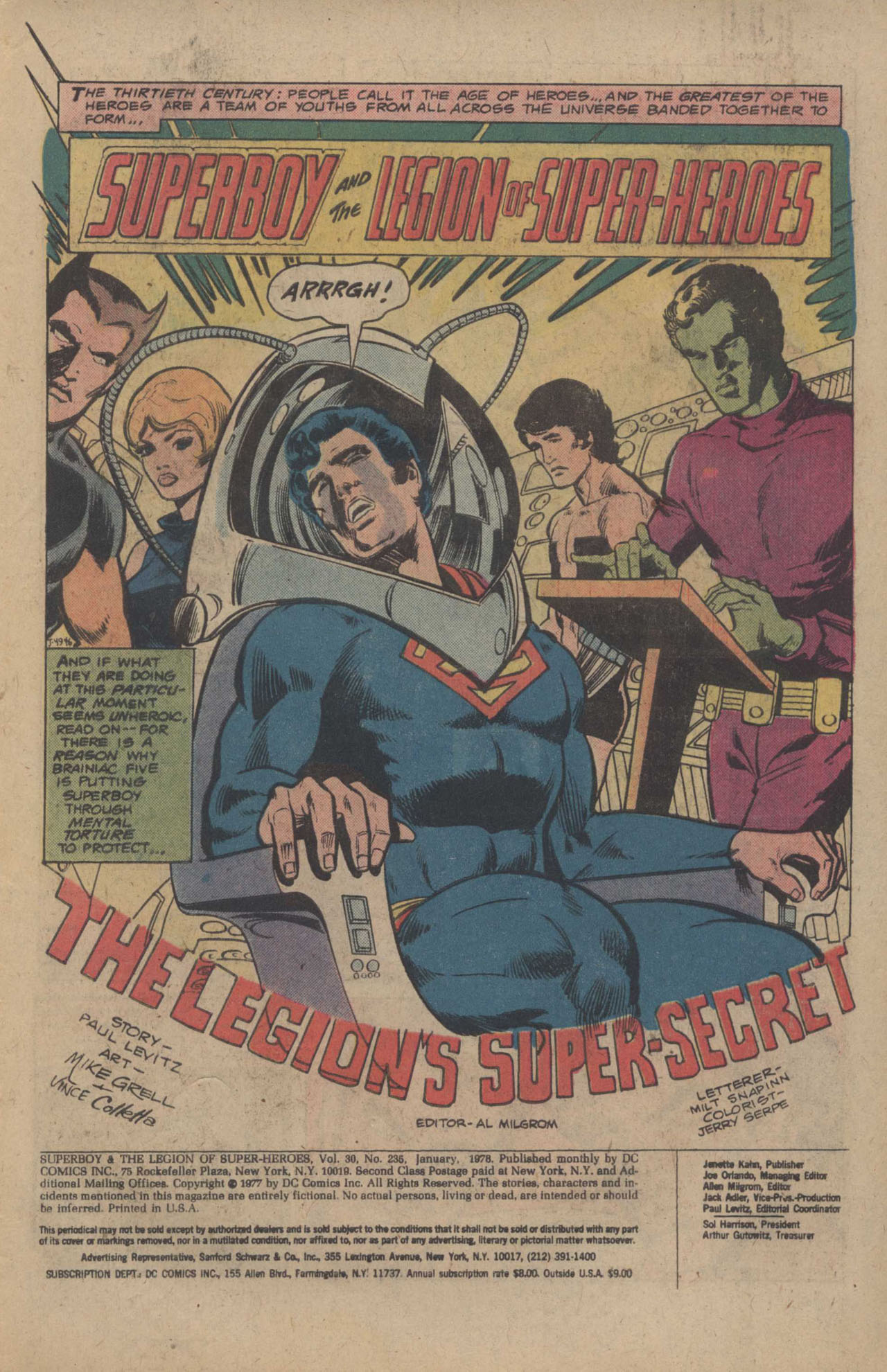 S&LSH was still a great value, maintaining the same oversized format that JUSTICE LEAGUE OF AMERICA held, with no reprints. That meant you got two stories in this single issue. Given the number of characters in the Legion, this was a boon in terms of being able to spotlight a greater range of them.The first story opens with the Legion performing a painful brainwashing procedure (Brainiac 5’s words) on Superboy, one they’ve been performing since the Boy of Steel started visiting the 30th Century. It’s all very cryptically discussed. But an alert comes in before the process is completed,.