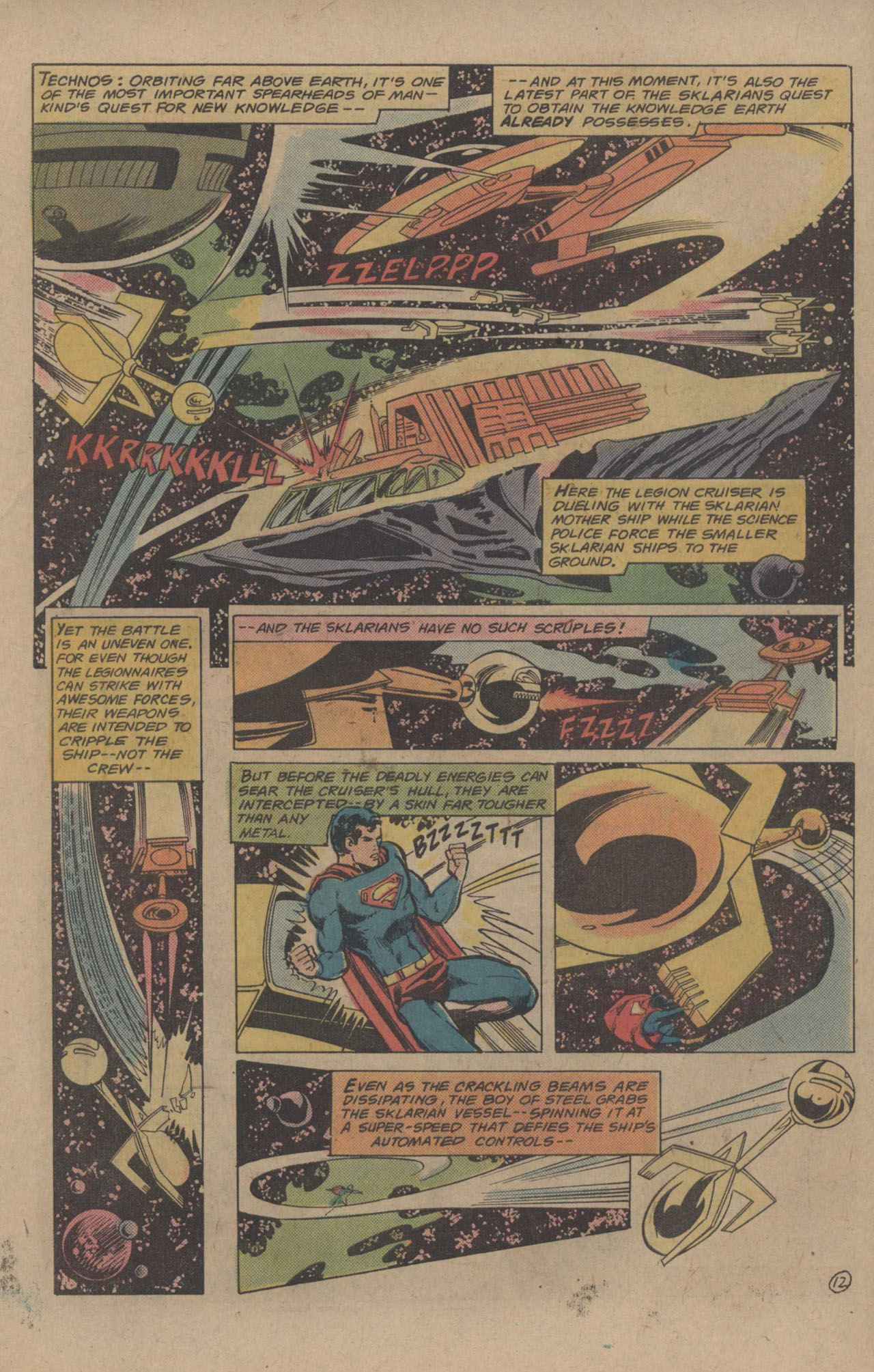 Brainiac 5, Sun Boy and Cosmic Boy discuss the attempted theft and the fact that it will almost certainly be tried again by the Sklarians. They indicate that the target was a serum, and that serum and what it can do is the reason they’ve had to mind-wipe Superboy for all of these years. Unbeknownst to them, however, Superboy has been eavesdropping with his super-hearing, and he’s rattled to ear his friends talking about routinely brainwashing him. But then another alert comes in–the Sklarians are attacking Technos, a research facility situated on a distant asteroid. The Legionnaires head for the site and engage in battle. Brainiac tells Superboy to stay out of the Life Sciences section–and when the Boy of Steel goes to help Sun Boy in that area, the solar-powered youth zaps him back with a burst of heat.