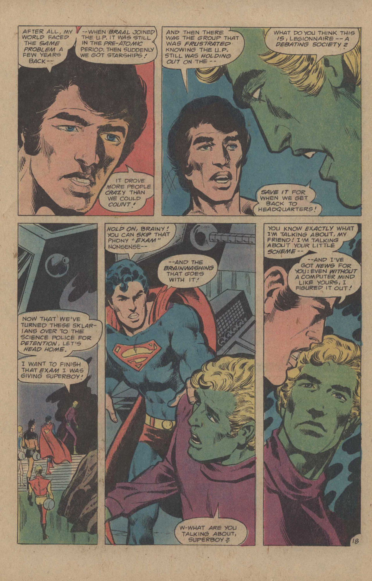 The Legionnaires hurry to the Life Institute an artificial island, where their old enemies the Sklarians are staging a raid, trying to make off with top-secret technology. After several pages of battle in which we get to see a number of Legionnaires do their thing, the Sklarians are driven off, without the tech they were attempting to steal. The Director of the Life Institute thanks Superboy and almost lets slip to him what that technology is all about, but Brainiac 5 hastily diverts Superboy from this line of questioning. Superboy complies, but he’s growing a bit suspicious.