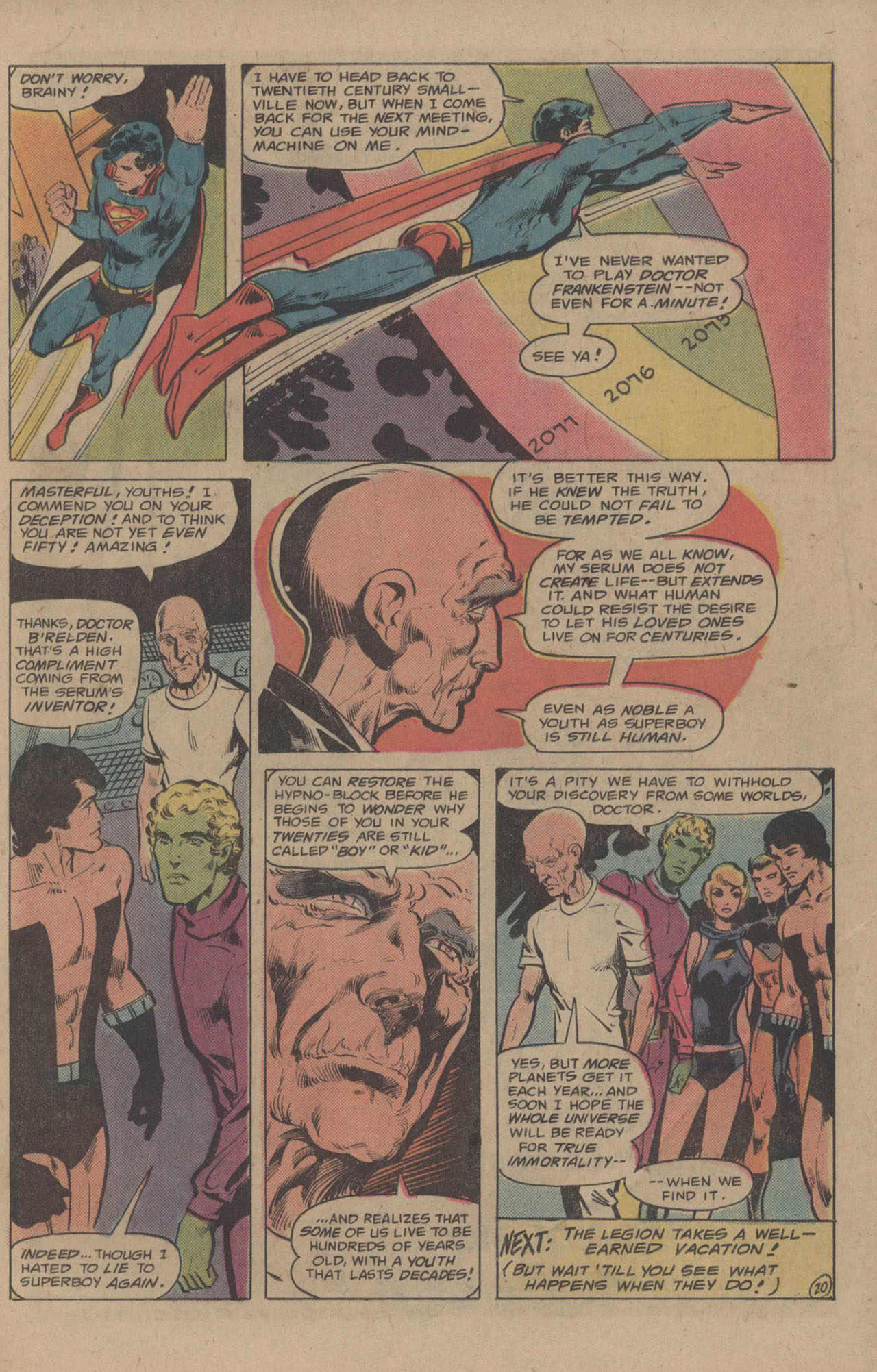 Superboy takes off for his home in the 20th Century, agreeing to let Brainiac 5 perform the brainwashing on him when he returns, to keep him from accidentally spilling the secret in the 20th Century. But after he goes, we learn that this has all been a deception. The Life Foundation’s serum doesn’t create life, it extends it. The average life span in the 30th Century is measured in hundreds of years. This is why the Legionnaires are still referred to as Boy or Kid even though they’re in their twenties–by the standards of the era, they are still youths. This is admittedly a ways to go to justify those names, especially as the characters begin to be treated more as adults–but it’s also a pretty good, pretty natural twist. But this is the last that was ever heard of it, consigned to “Mopee mountain” along with Superman’s image-changing glasses, Superman’s missing 100 years and other canon-changing stories that were subsequently ignored.