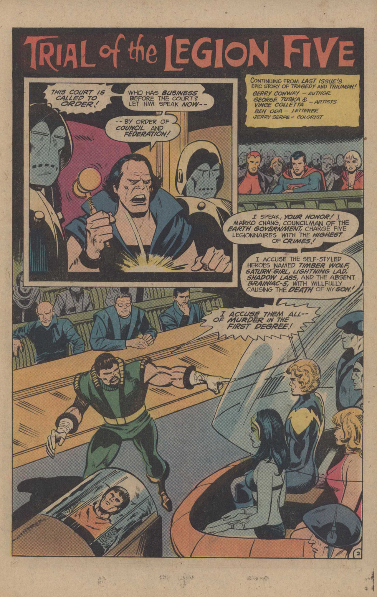 The trial plays out directly, with each Legionnaire in turn recapping the events of the adventure wile a pair of shadowed figures breaks into the courtroom. They are, of course, Brainiac 5–who had been missing from the trial–and the now-recovered Wildfire. Back on his feet, Wildfire is able to duplicate the Psycho-Beast’s radiations and bring the seemingly-dead son of the Councilman back to life. This is why Brainiac 5 acted as he did–both men could be saved, but only if Wildfire was saved first. Unfortunately, it’s far too easy to guess the score on this story early on, which made the bulk of it a tedious exercise in waiting for the eventual revelation that the reader was already ahead of. It’s competently told, but obvious, and far from the best thing that writer Gerry Conway ever produced.