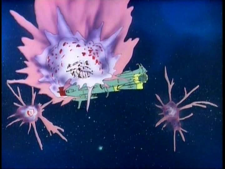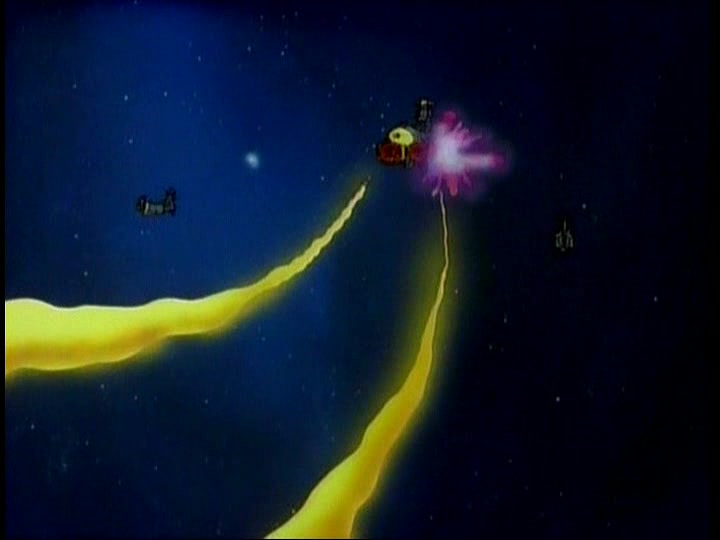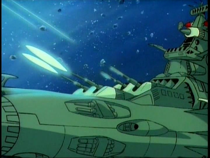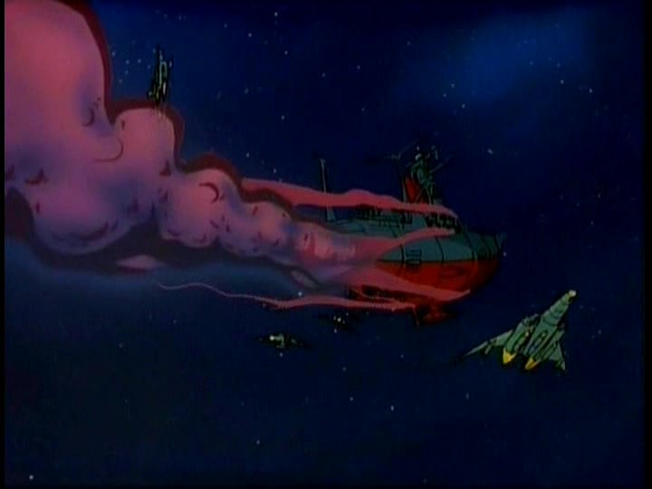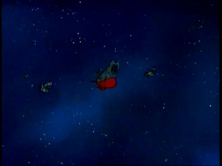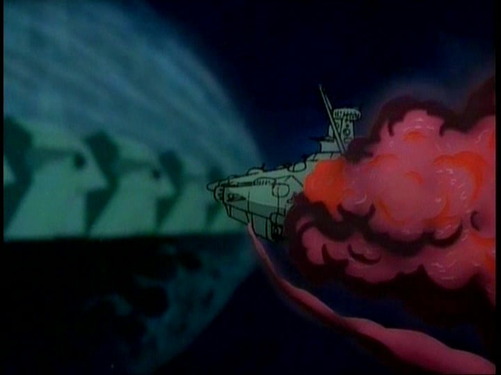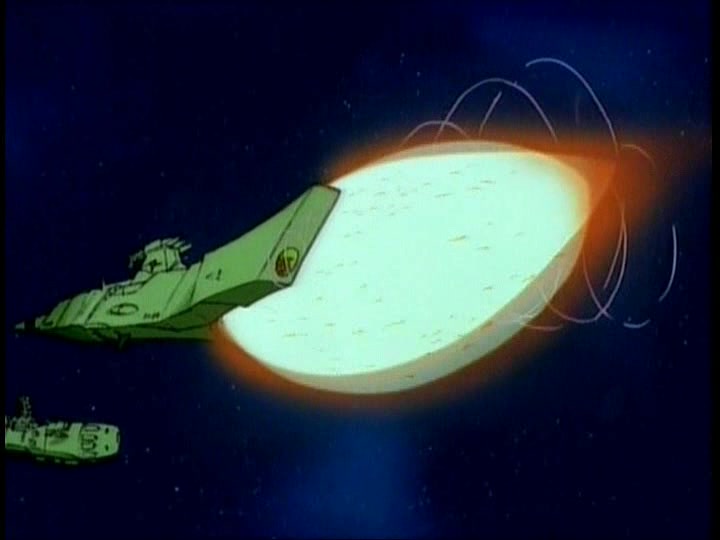 The Comet Empire fleet diverts a relatively small portion of their forces to meet this incoming flank attack. Their Impulse Cannons (referred to as simply Shock Cannons in STAR BLAZERS, the same type of main weapon used by the Earth forces) are devastating, with a single shot enveloping smaller Destroyers and escort ships and obliterating them. In a matter of minutes, Captain Slate and his fleet are wiped out–STAR BLAZERS cuts the moment when his bridge explodes around him, but cutting between Slate saying that his ship is taking heavy fire and then the ship exploding gets the point across. Nobody tries to pretend that Slate or his men got out alive.