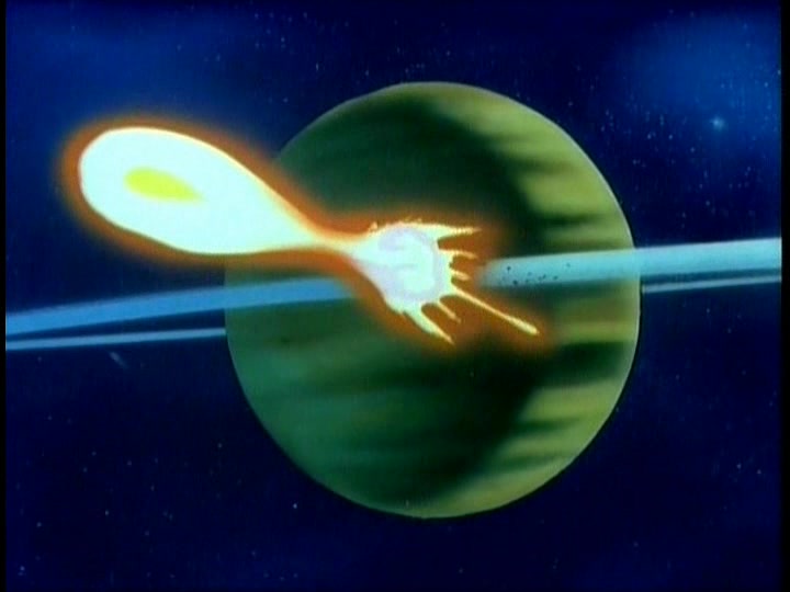 As the episode opens, the Earth Defense Forces fleet is minutes from contact with the invading Comet Empire fleet. While the Star Force destroyed the enemy’s carrier fleet in the last episode, the Comet Empire still has the greater numbers. As the enemy hits the Saturn area, Captain Gideon sends the task force stationed at Hyperion, Saturn’s moon, to strike at the invaders from their flank. Captain Slate enters into a firefight with the Comet Empire ships, but things do not go as planned.