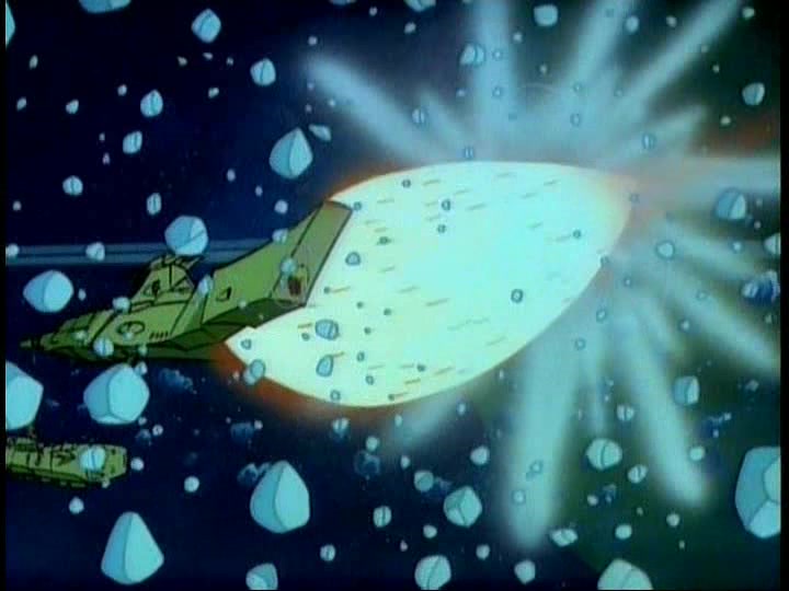 This turns out to be a terrible decision on the part of the Comet Empire fleet because, as General Bleek tries to fire his Magna-Flame Gun again, it backfires, causing turbulence within the ice ring that sends the Comet Empire ships spinning out of control. STAR BLAZERS chalks this up to trying to fire the super-hot weapon within the deadly cold of the ice ring, whereas in YAMATO 2, it’s the result of attempting to open up a warp field in the middle of a debris belt.