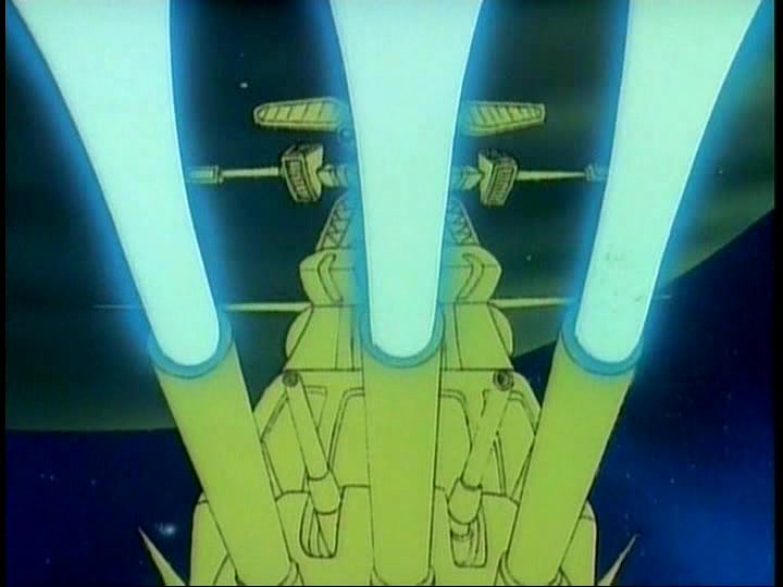 As the Comet Empire fleet approaches, Captain Gideon gives the order for the Earth fleet to charge their Wave-Motion Guns. But the invaders are still several minutes from being within the Earth fleet’s effective firing range. And they’ve got a trump card weapon. STAR BLAZERS calls it the Magna-Flame Gun and changes its description of how it works from YAMATO 2, deciding that it simply has a much longer range than the Earth ships’ weapons. In face, the weapon is a Warp Cannon (called the Burst Energy Transport Cannon in YAMATO 2) which works like the Gamilon’s SMITE system–except in this case, rather than combat warping fighter planes, General Bleek is able to warp the shots he’s firing, so they come out of nowhere in the midst of the Earth forces, scattering and destroying them.