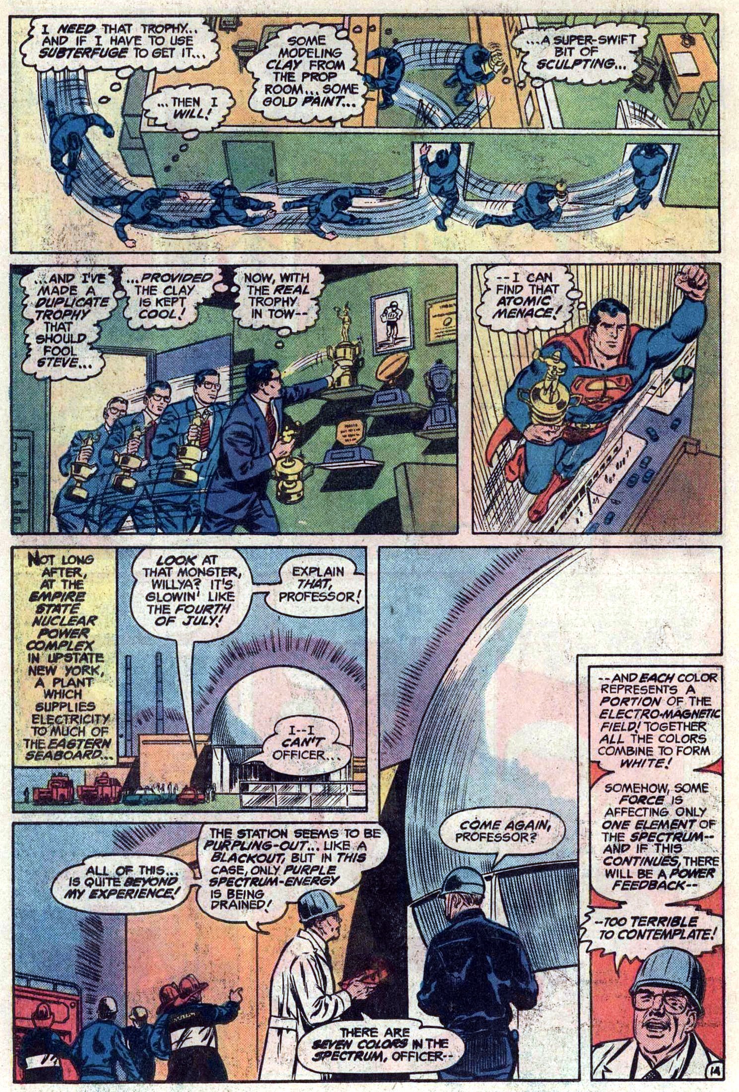 In a rare bit of continuity no doubt masterminded by writer Gerry Conway, the story opens up with Superman helping to clean up the massive amounts of damage the moon-aliens’ attack over the past two issues had done to the world. The opening few pages are devoted to this combination of recap and simple super-feats. But when Superman heads back towards WGBS to do his regular newscast as Clark Kent, he notices that the building is surrounded by a strange glow, and the building is suffering from a power failure. Descending to the ground below, he appears to enter combat with an unseen adversary.