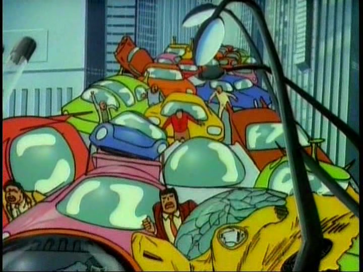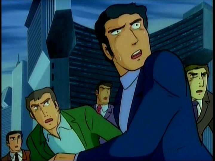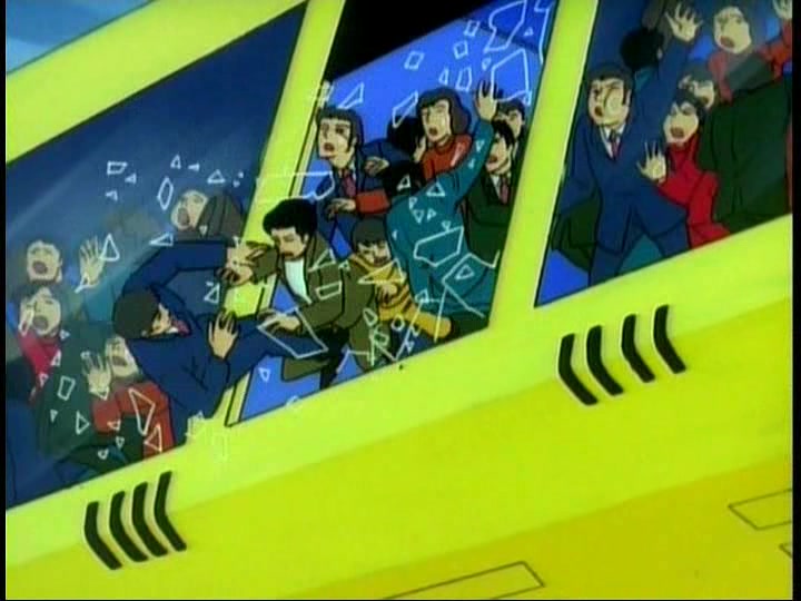Back on Earth, with the Comet Empire approaching and the Earth Fleet wiped out, the Defense Council is trying to figure out how to mobilize the scant forces remaining to them. The Commander asks the President to keep the situation under wraps to avoid panic, but it’s too late–word of the Earth Fleet’s destruction has already leaked out, and people are going crazy. A lot of this footage got removed from STAR BLAZERS because it’s pretty disturbing stuff as the citizens of Earth flood train stations and airports–so much so that people get forced out of windows and onto the tracks. Car crashes and fights are breaking out everywhere, and we see one panicked guy pull out a gun and kill himself right in the middle of the street.