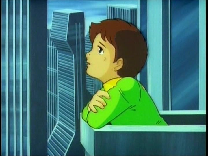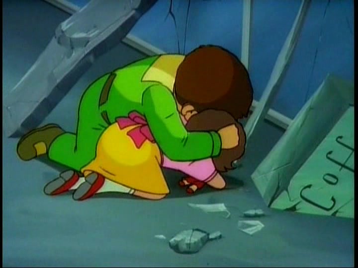 IN another bit cut out of STAR BLAZERS, Venture’s younger brother Jordie rescues a young girl who is almost trampled by a mob of people heedlessly running to get to the spaceport, despite not really having anywhere they can go. STAR BLAZERS did keep in the follow-up moment, where Jordie, now safely back at the family’s apartment, casts his eyes skyward and hopes for the Star Force’s return. The rioting continues at the space port, and STAR BLAZERS does surprisingly keep in a powerful moment that made a strong impact: a man is knocked aside by the crowd and his suitcase full of money falls to the ground–but everybody just tramples over it heedlessly as they try to escape. In such a situation, it’s just worthless paper.