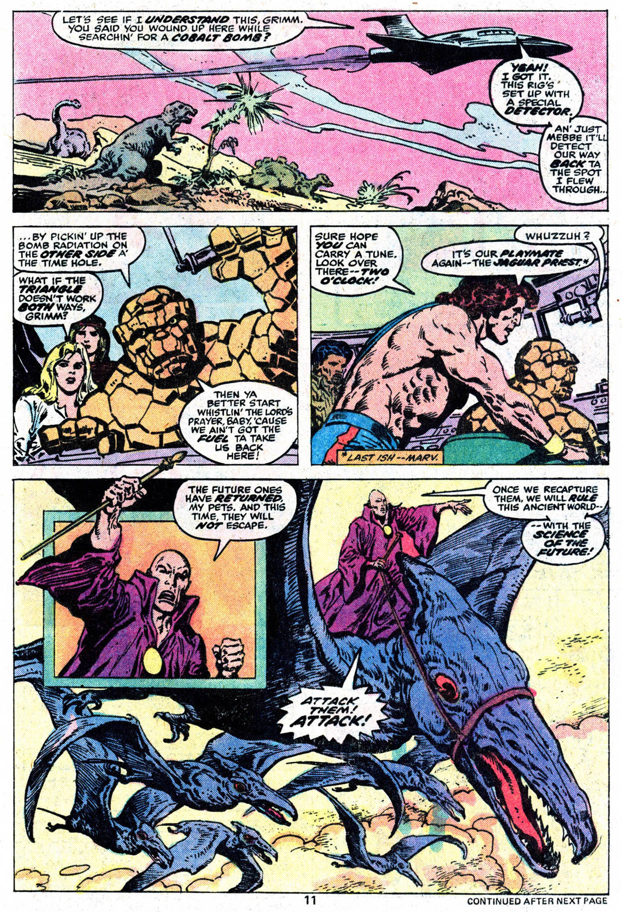 As mentioned earlier, writer/editor Marv Wolfman used this two-part story to wrap up the outstanding plot elements of one of the most unfortunate series Marvel had launched in this era, SKULL THE SLAYER. It was a quasi-barbarian/quasi-jungle adventurer sort of a series that in its eight issues had almost as many artists and half as many writers. The whole thing was a bit of a mess. But Marvel policy in this era was to try to find places to bring such stranded series to a close, and so here Wolfman took it upon himself to wrap up Jim Skully’s adventures by having the Thing pilot an experimental plane into the same Bermuda Triangle gateway that had first sent Skull and his friends to this lost land.