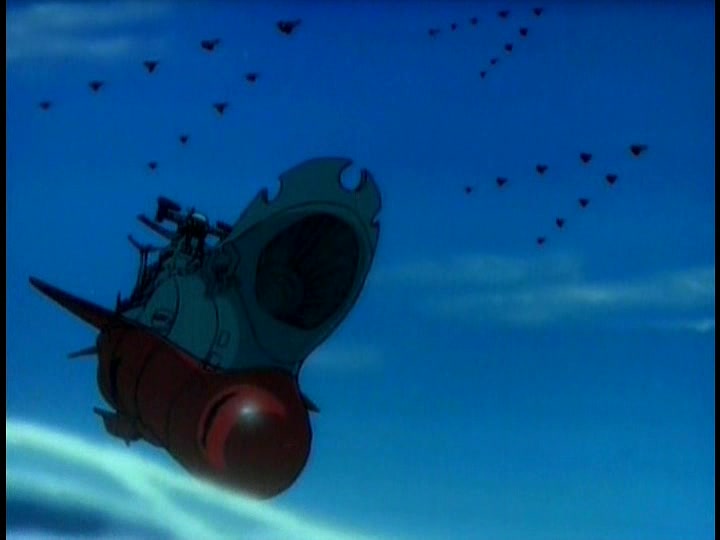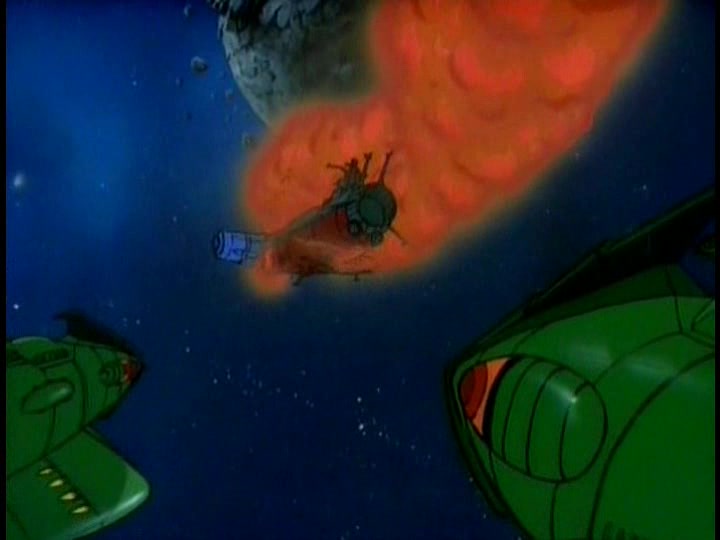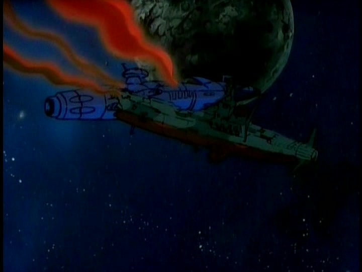 But before we get into the episode proper, it’s probably worth providing some background information and context. This is all stuff that nobody watching STAR BLAZERS would have been aware of, but it’s critical nonetheless. Originally, the first series of YAMATO was a bit of a bust in Japan, and it wasn’t until STAR WARS was released that a groundswell of fan interest in the property led to a compilation film being released that edited that first season into a single picture. It was a monster hit, and so a sequel was the next logical step. That sequel, SARABA UCHU SENKAN YAMATO, told the story of the Comet Empire invasion of Earth and killed off most of the cast along the way, including Desslok, and eventually the great ship itself in the final moments–Wildstar, with Nova’s dead body seated next to him, chooses to kamikaze the Yamato into Zordar’s final battleship to protect the Earth, at the cost of his life.