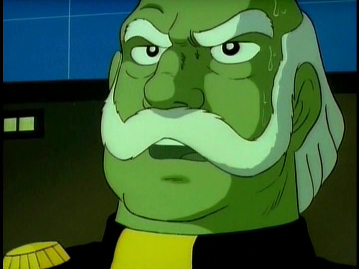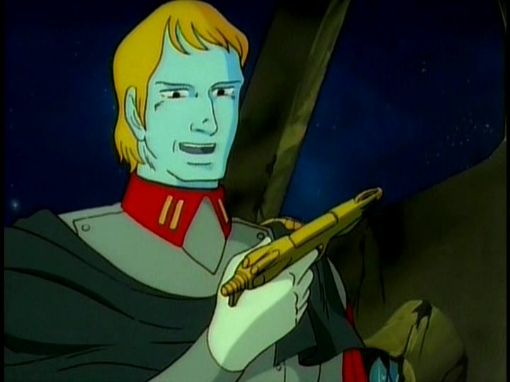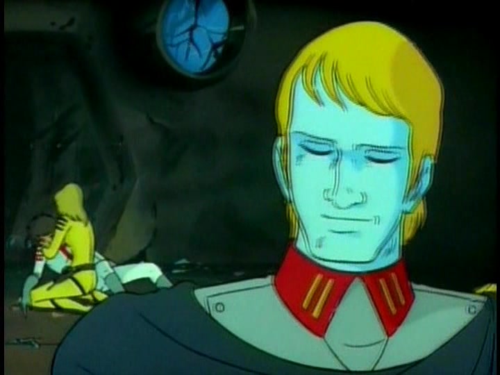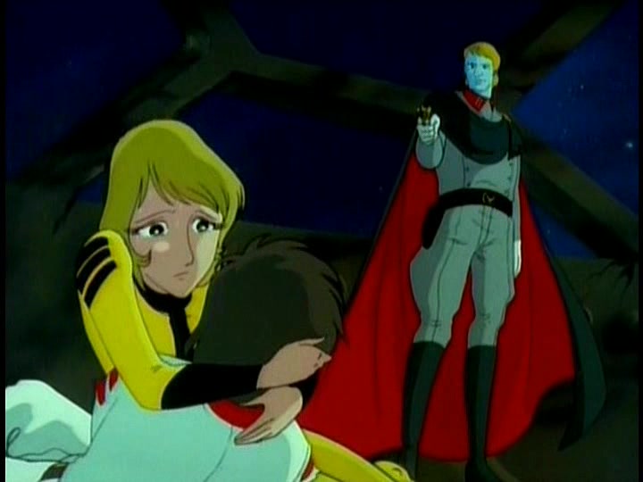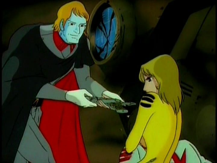 The episode opens on the Argo and Desslok’s flagship, still smashed together. Fighting is going on between the scattered Gamilon forces and the space marine landing party. Nova makes her way through Desslok’s ship, searching for Wildstar. But Wildstar has found Desslok and Talan on the bridge, and despite the fact that Wildstar is badly wounded (amazingly, STAR BLAZERS doesn’t edit out the blood in this sequence) he’s got the drop on the Gamilon leader, whom he tries to convince to stand down.